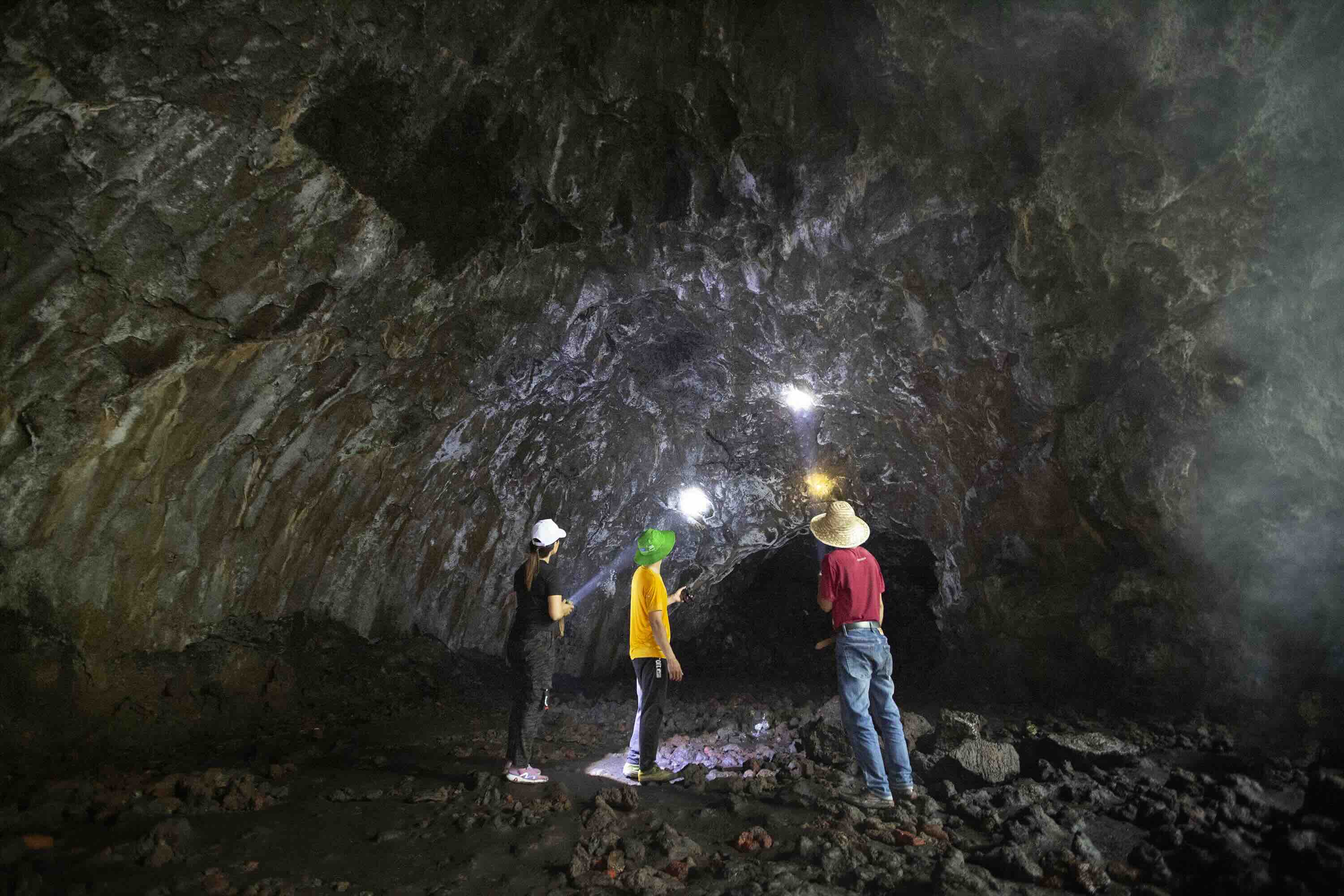 Cave C8, near the crater of Chu Bluk, is considered the area’s most beautiful, its arched entrance draped in ferns and moss like a green gateway into an ancient world. Excited yet cautious, we crossed a 20-meter stretch of jagged basalt scoria to descend into the cave. Turning back, we couldn’t help but marvel as shafts of sunlight pierced the fern fronds above the arch and glinted on the moss-covered rocks to create a magical scene.