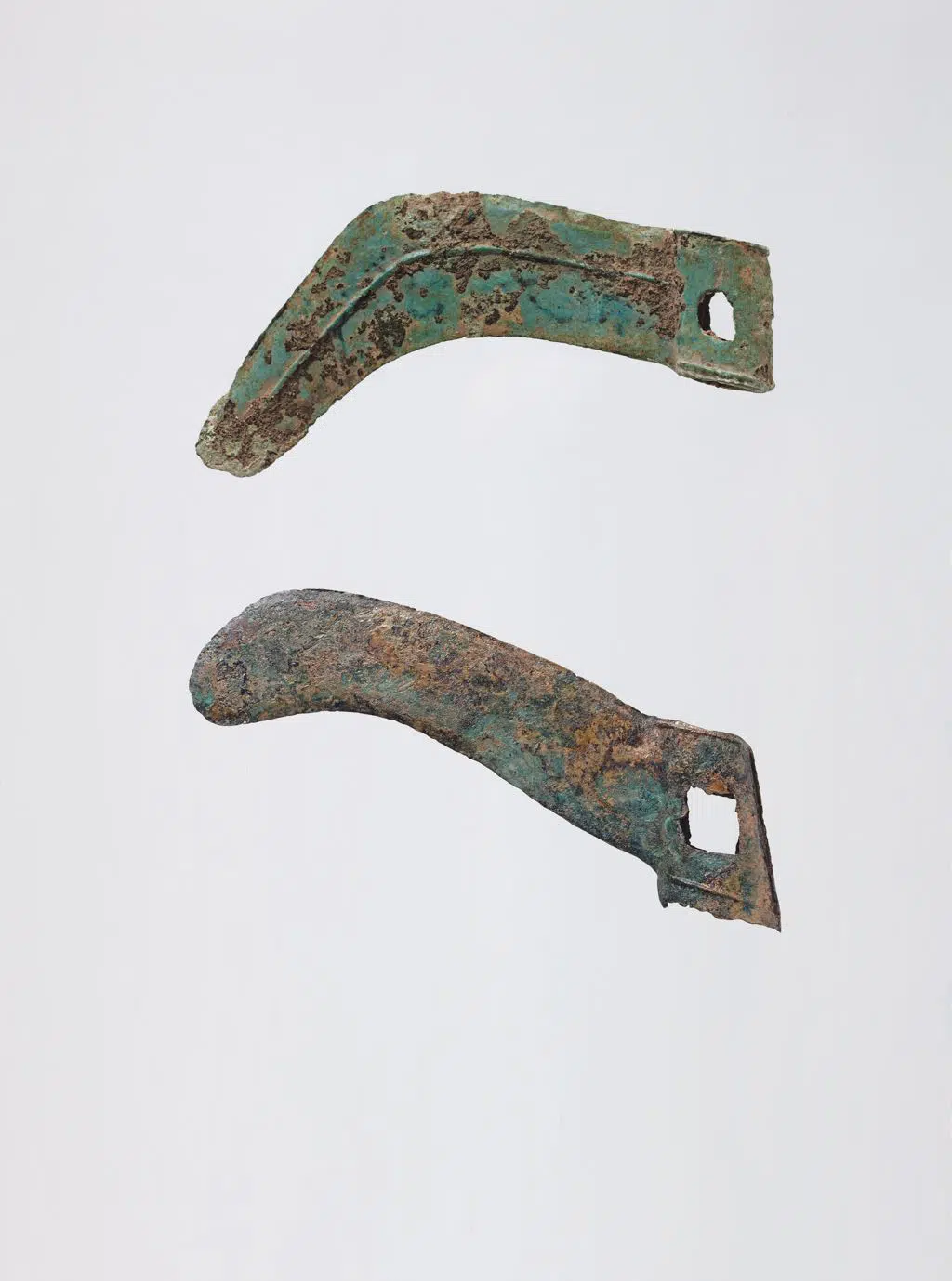Compared to other contemporary cultures in Central Vietnam and Southeast Asia, the Dong Son culture stood out thanks to its fine bronze-wares. Tens of thousands of Dong Son bronze items have been found. These items were designed to serve people’s work and daily needs. Housewares include situla (large bucket-shaped vessels), pots, jars, vases, kettles, ladles, spoons, bowls, plates, and lamps, etc. Agricultural tools include axes, ploughs, hoes, and shovels, etc. Dong Son people made sickles to harvest their crops more efficiently than previous tools, whichcould only cut one ear of rice at a time. Tools for carpentry include various chisels. Weaving developed during this period thanks to new weaving tools. Apart from ceramic shuttles, there were specialised bronze tools such as knives and brushes. Some knives had flat handles with small spikes like those on a brush. This specialised weaving tool combined two functions: to cut and to brush. Dong Son hunting tools and weapons include various weapons of attack and defence, such as spears, daggers, battle axes, javelins, shields, bows and arrows, etc. Other items such as musical instruments, ritual objects, jewellery, and statues are plentiful in terms of quantity, type and design.