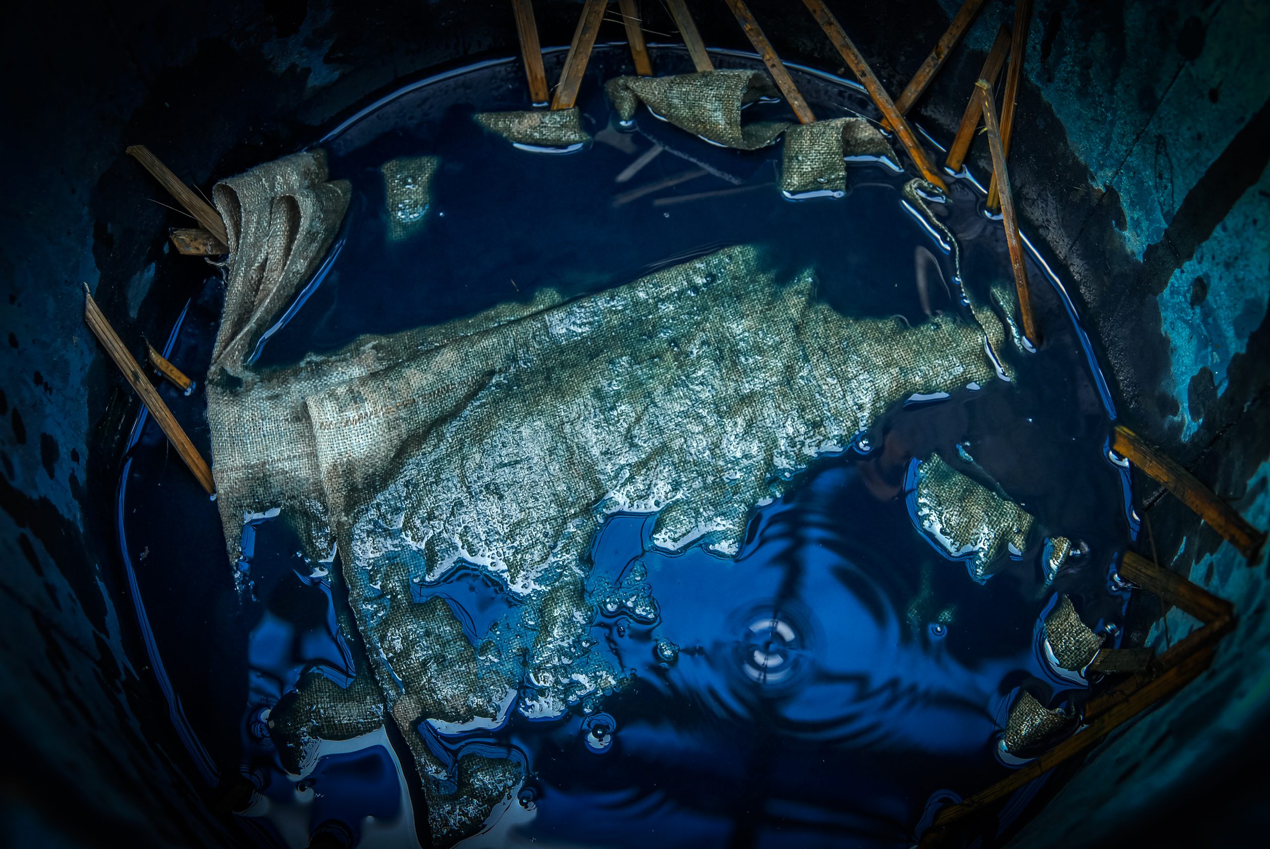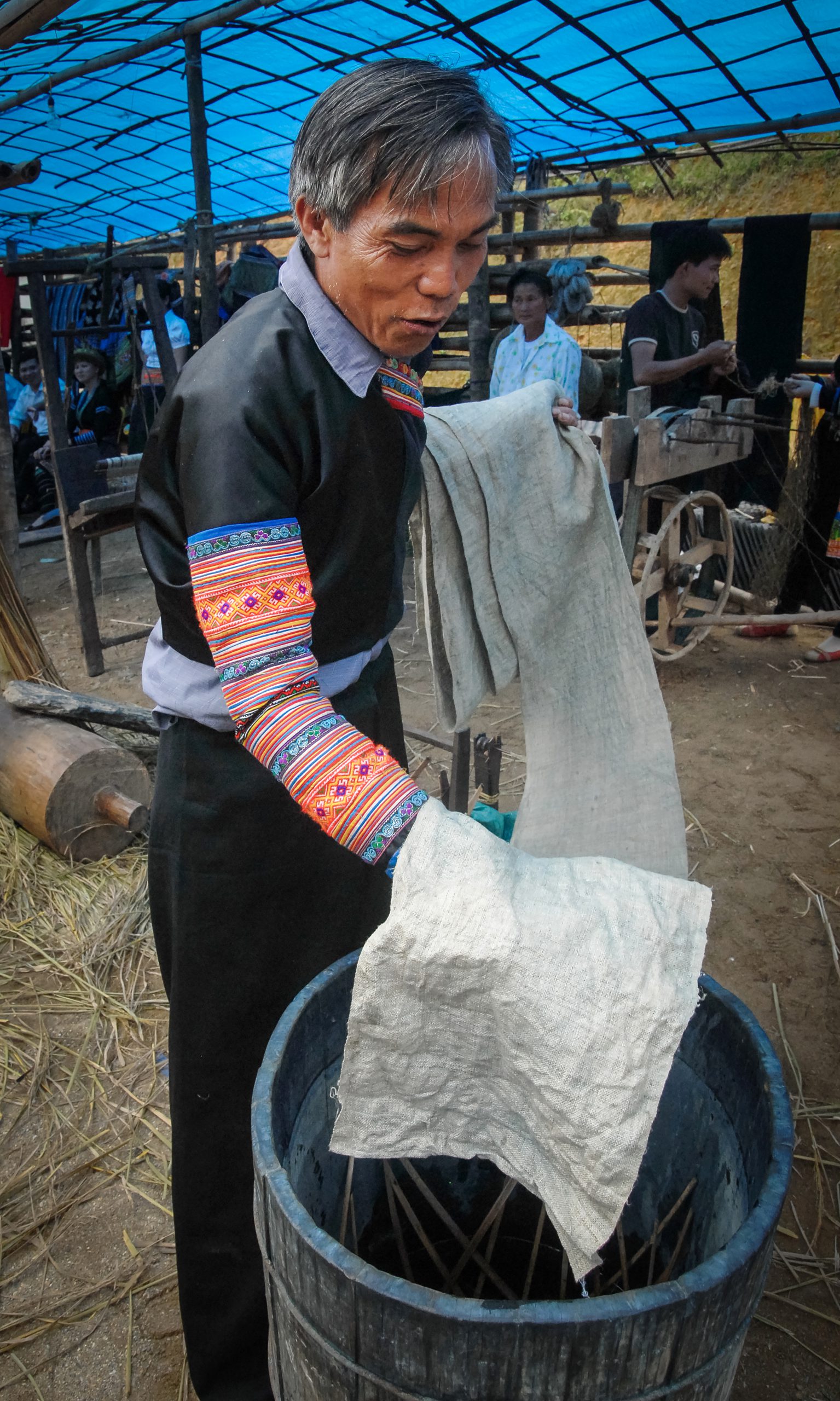 Indigo is central to the clothing of Tay, Nung, Thai, H’Mong, Dao, and some other indigenous groups in the Northern highlands, as well as some ethnic groups in Central Vietnam. The lengthy dyeing process begins from the harvest. The indigo plants are sown in the third lunar month and harvested three months later when the bushes stand roughly one meter-tall. The bark and leaves are removed, soaked, and fermented in water tanks for 10 to 15 days, until the water turns blue. Powdered lime is then added and mixed until an indigo paste settles at the bottom. This paste is collected and put into baskets to drain. One month later, it’s time to make the vats of dye. In large pots, the artisans mix boiling water with fragrant leaves and indigo paste, and ferment this mixture for two to three days. At this stage, the water turns a deep dark blue color and is ready to be used for dyeing. Fabrics, usually cotton, are repeatedly soaked in the indigo dye two or three times per day for several days, until an even color of the desired light or dark shade is achieved. It takes half a year to produce one new indigo-dyed sheet.