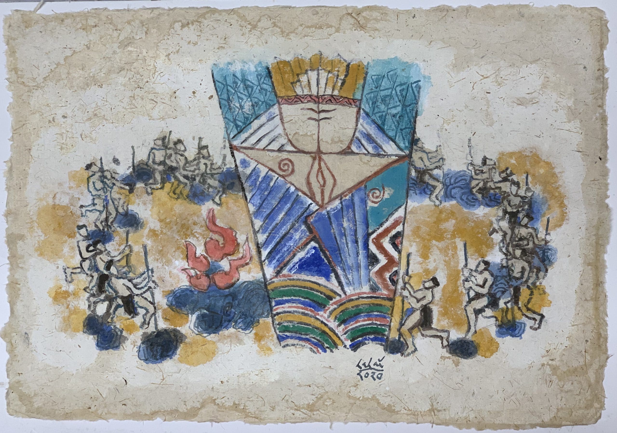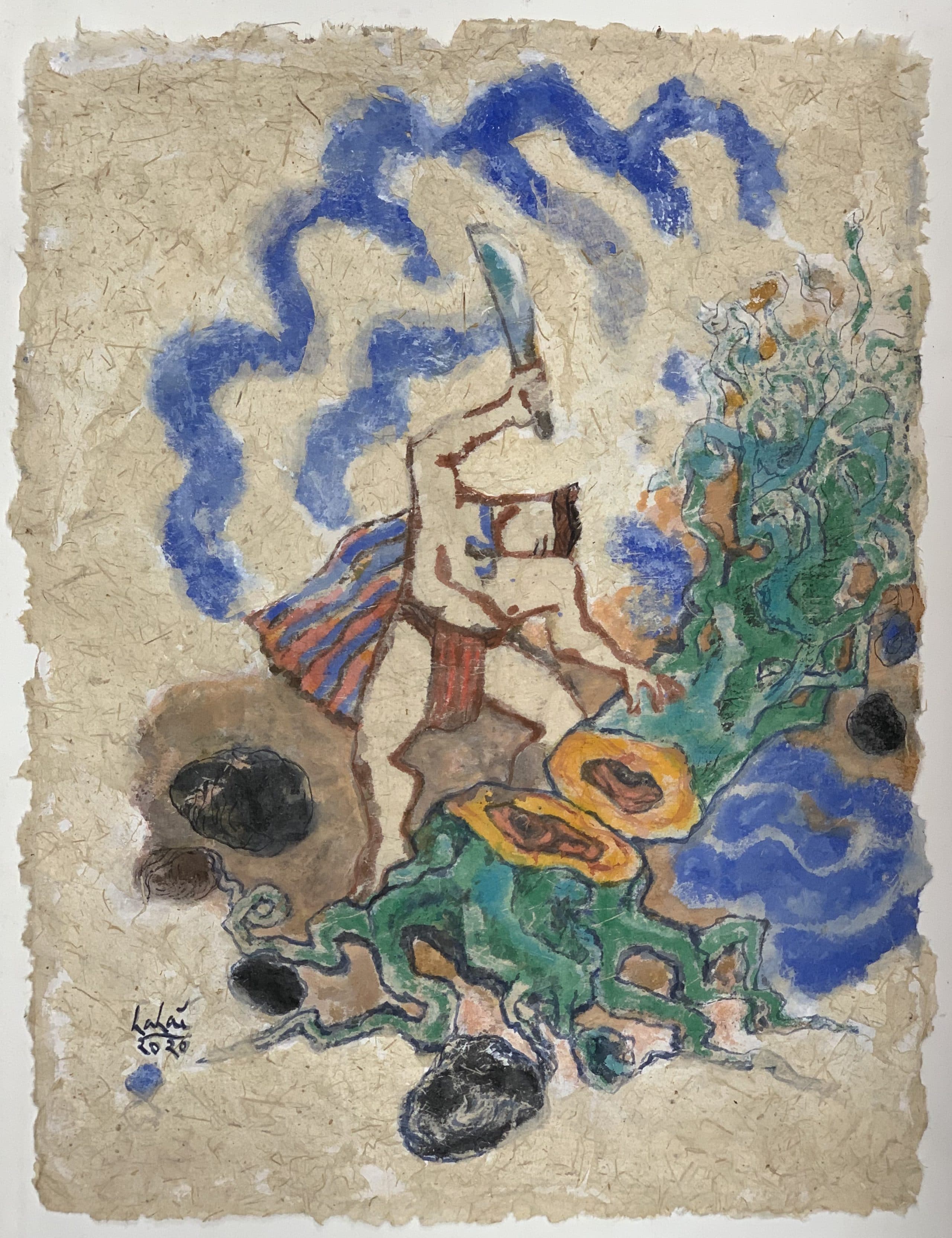 Traveling to Long Bien, he met a nine-tailed fox called the Evil Fox. This fox usually snuck out of its cave at night to prey on children. Lac Long Quan used five colored threads to make a rope and placed it by the cave’s entrance. When the Evil Fox snuck out, it was strangled. Leaving Long Bien for the mountains of Phong Chau, Lac Long Quan encountered a gigantic pine tree. Having lived for over a thousand years, this tree had turned evil. The Evil Tree usually broke into villages in human disguise and stole cattle and poultry. Lac Long Quan chopped it down with a giant axe, killing it. Once the tree fell, the evil spirit that inhabited it departed.