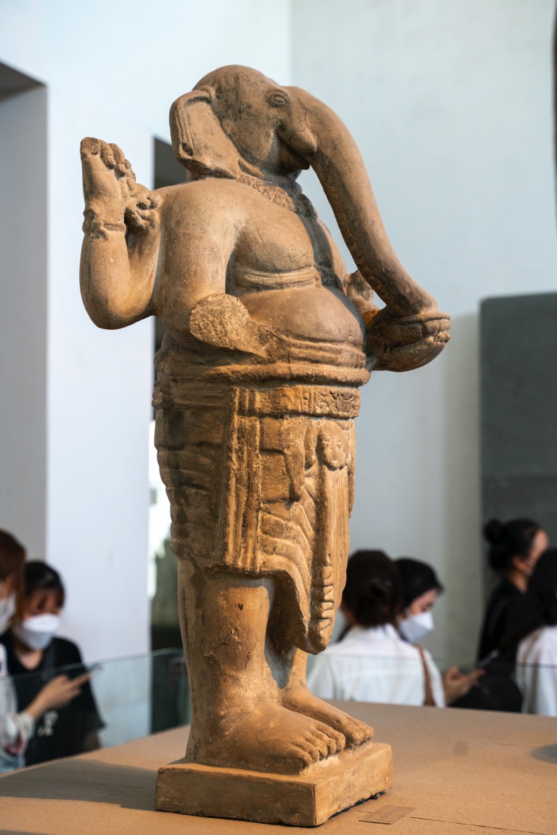 The deity Ganesha first appeared in Indian sculptures circa the 5th century AD. Since then, stories of the god were often recounted in Purana literature. However, many researchers suggest Ganesha appeared earlier on Indo-Greek coins and in early sculpture works in the Mathura region. But why an elephant head? Some scholars suggest that when the Aryans migrated to India, the native tribes living in the forests had been worshipping elephant deities in a bid to prevent rampaging elephants from destroying their fields and threatening people’s lives. Early accounts also describe an angry elephant-headed deity, called Vighna-asura in Sanskrit, who caused trouble to other deities as well as human beings. Over time, the practice of worshipping elephant deities became a recurring theme in sculpture and mythology, with the deity Ganesha, the son of Shiva and Parvati, depicted with a human body and an elephant head. There are variations in explaining the origin, form, and symbolism of Ganesha. Under the influence of Indian culture, ancient Southeast Asian countries soon adopted the image of Ganesha in their sculptures, as seen in the works of pre-Angkor and Champa circa the 7th century AD.
