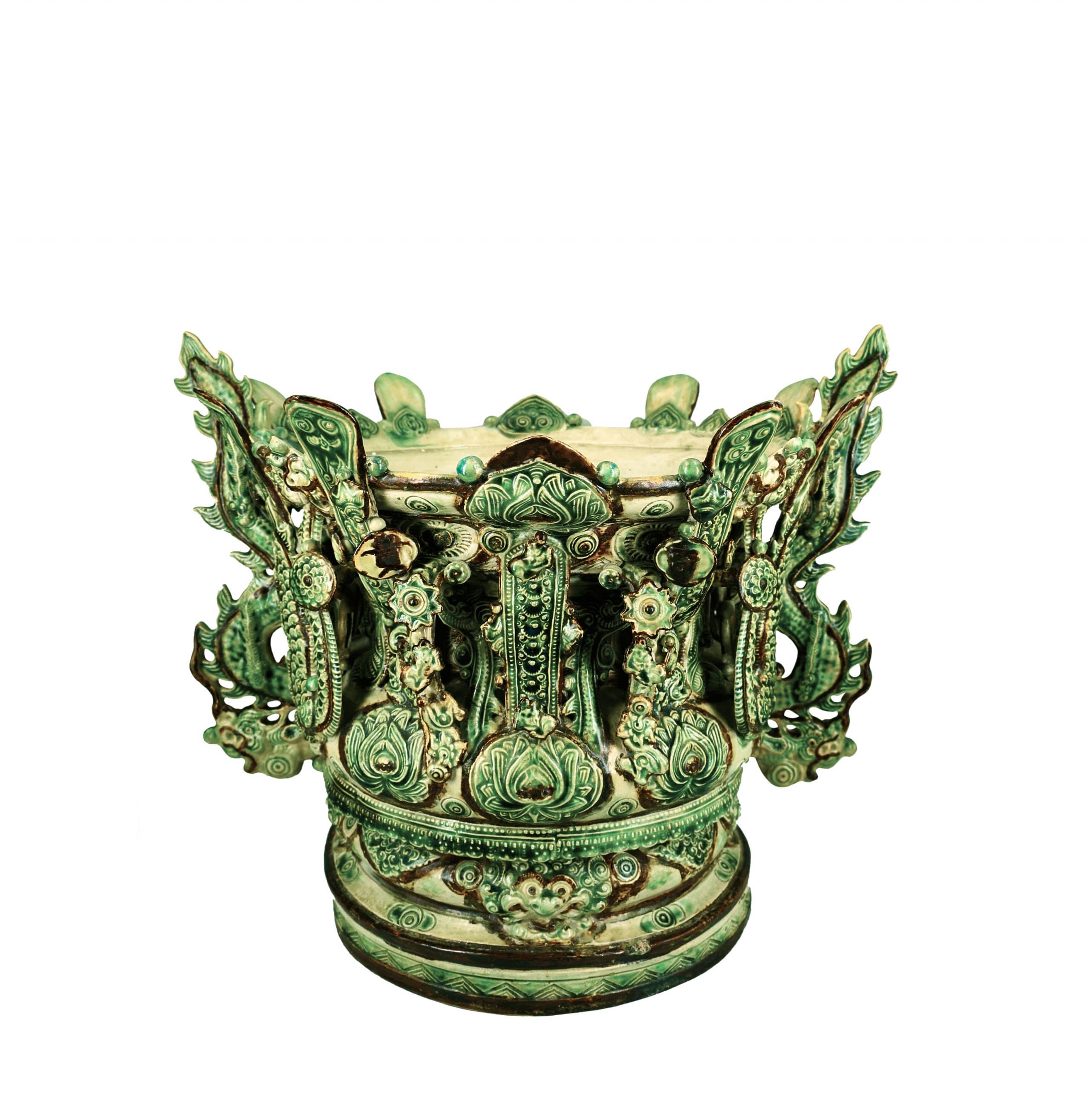 An external gluing technique was also used. Decorative patterns are crafted or molded separately, then applied to unbaked ceramics before the pieces are kilned. This technique was developed during the Mac – Renaissance Le Dynasty for religious items such as cauldrons, incense urns and nghê statuettes. Swathes of glued decorative patterns were draped in green enamel to reduce their intensity and add a solid touch to the patterns.