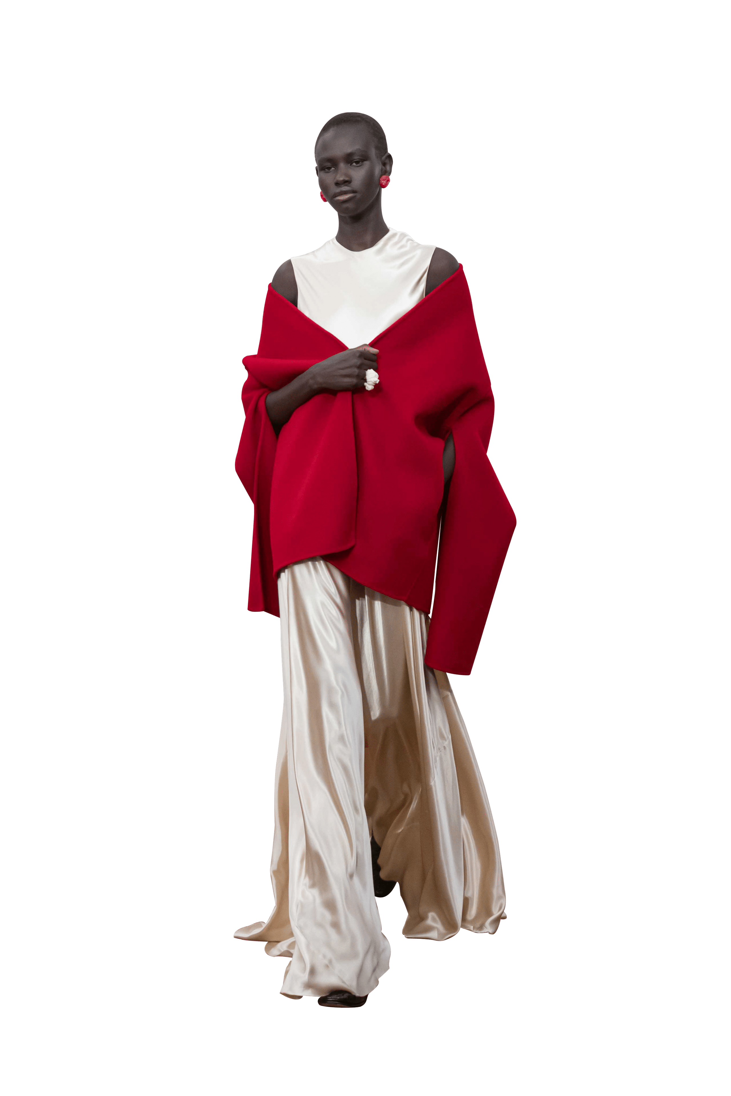 Maraschino red, or cherry red, is quickly becoming the hottest color in Fall/Winter 2025 collections. This captivating shade appeared frequently on runways, from striking monochromatic red outfits by Calvin Klein to subtle accents in Khaite’s designs. Maraschino red was skillfully used to brighten outfits with leather pants and oversized hoodies, creating unique color contrasts and showcasing the wearer’s bold personality.