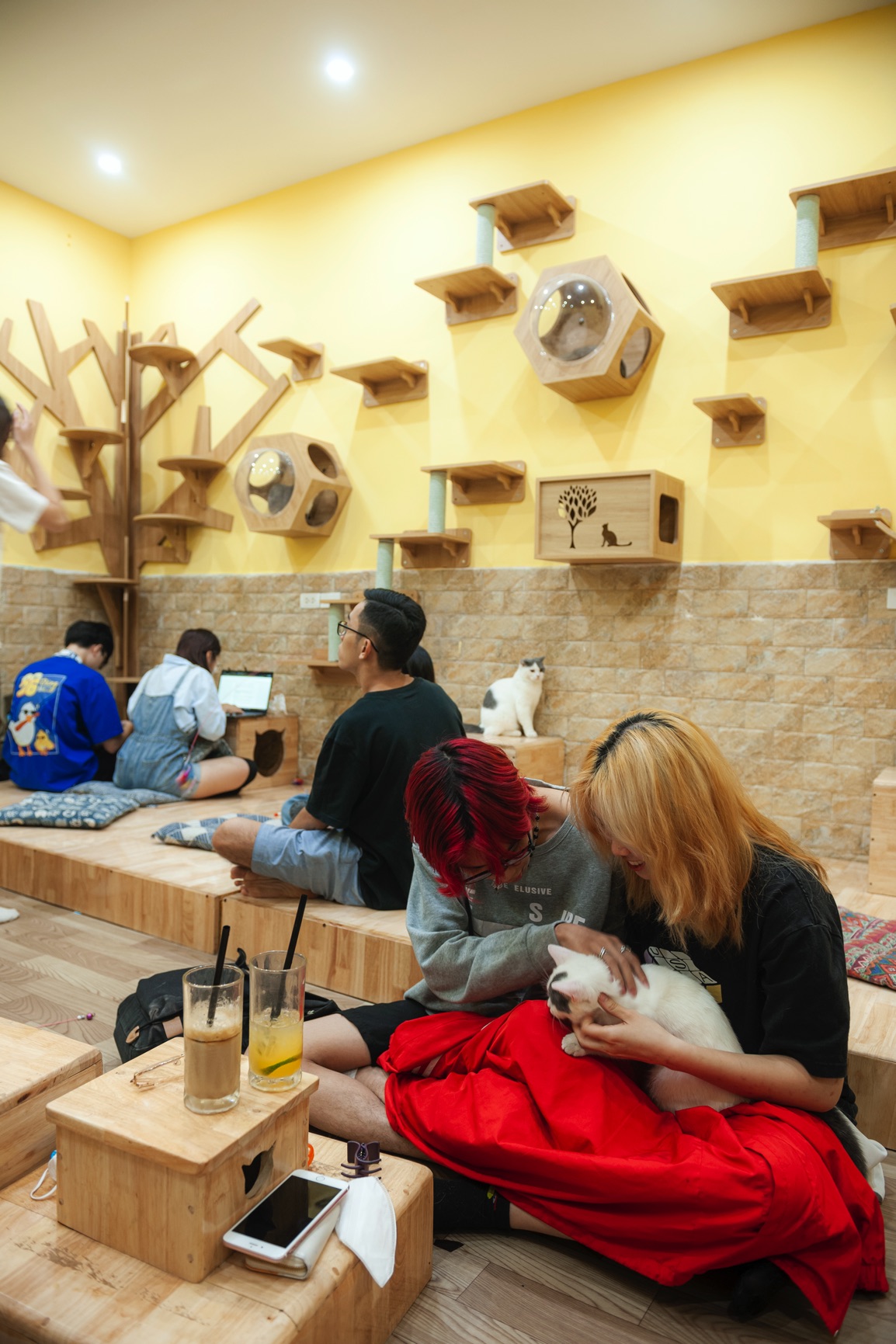 In addition to amenities such as veterinary hospitals, pet food and toy stores, grooming spas, and beauty salons, pet cafes are places where owners can relax with their pets. Since cats do not easily interact with other species, most cat cafes are more “selective” than other pet cafes that accept dogs or birds with their owners. At first, cat cafes were established to support stores that sold cat food, supplies, and toys. They have since evolved into an important amenity. The Lizzy House Cat Café is one such establishment, located at 160 Trung Phung, Dong Da, in a simple attic above a cat shop on a newly expanded street leading from a small alley. The majority of the cats here are British Shorthairs. The shop’s owner, a young man, stated that he opened this venue for personal reasons rather than profit. O Meo (translated: Cat Nest) Tea House at no.3, 52 Giang Vo alley, Dong Da, on the other hand, is quite busy, with a play area for cats to cavort and space for young people to relax and study. There are even signs instructing guests how to play with the cats that read: “Treat cats with care.” Young people playing with cats evoke images from contemporary romantic poetry, “And please smile again, my dearie/Dreary as a sick mutt you are not/Nor a sleepy cat in my arms” (Nga – Nguyen Sa). I wonder if couples are predisposed to express their affection indirectly via cats.