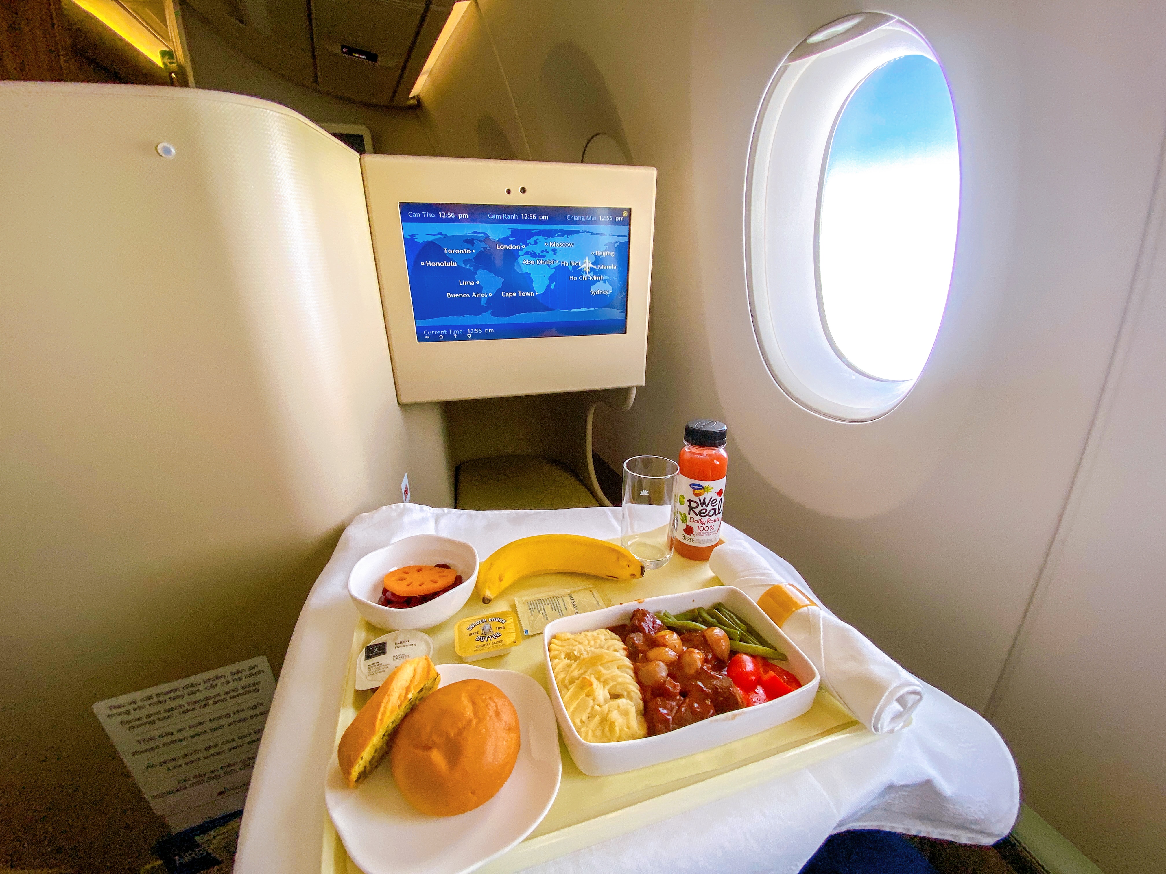 My flight was on an Airbus A350-900 XWB, the most modern wide-body aircraft. The business class seat had a generous amount of personal space. I was surprised when the business class meal was served hot in a container sealed with aluminum foil. This meal had previously been served uncovered for passengers’ convenience.