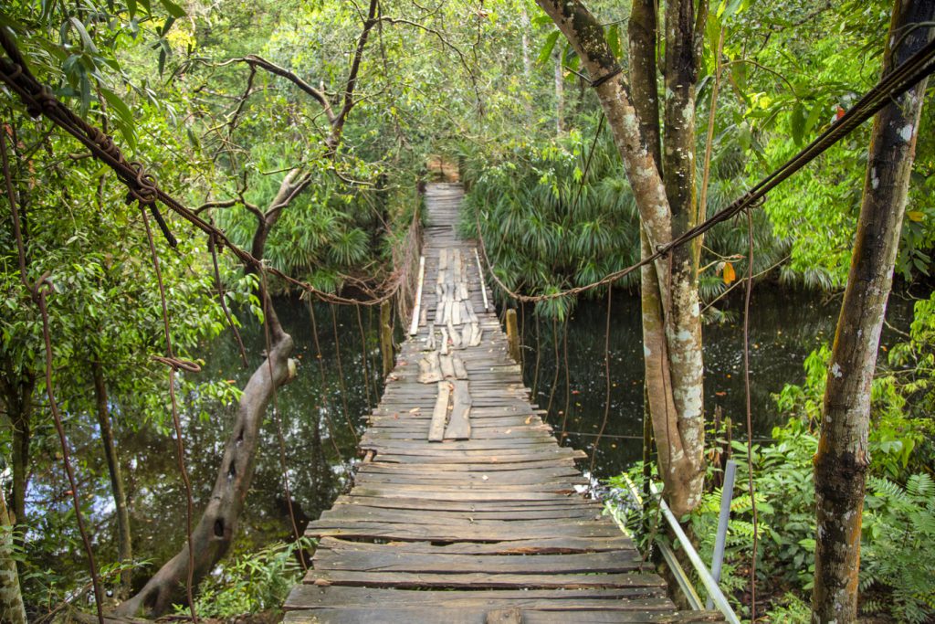 We crossed the old, rickety suspension bridge, its planks swaying with each step. Beyond the bridge, we entered a forest, with a canopy of cool green leaves hanging overhead. Gusts of wind occasionally parted the leaves, allowing sunlight to dance on the winding path strewn with tree roots. Walking in the sunlit forest was pleasant due to the higher oxygen levels in the air. I took deep breaths of the fresh, cool air, feeling invigorated as I strode forward, while the sound of the stream rushing over the rocks grew closer.
