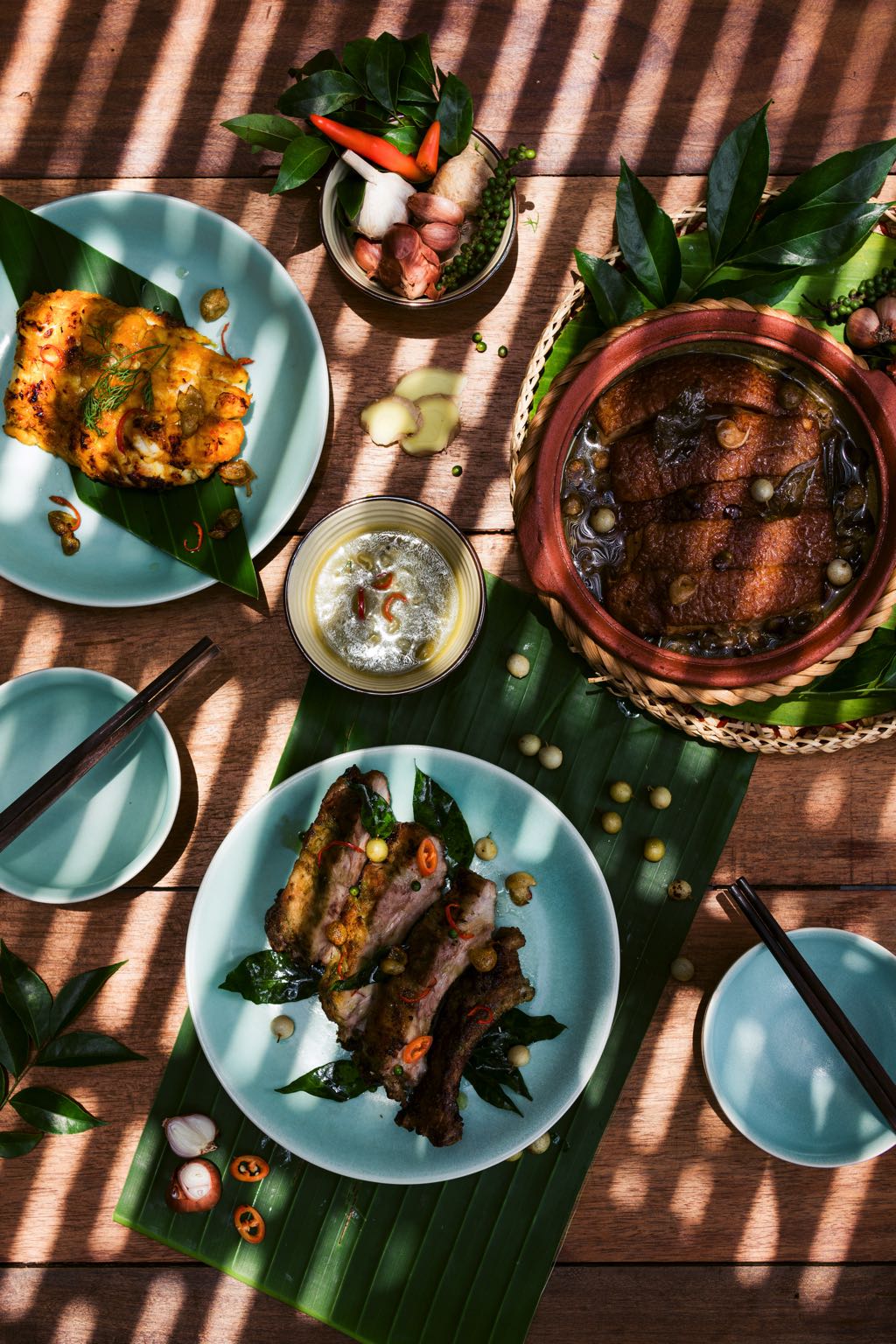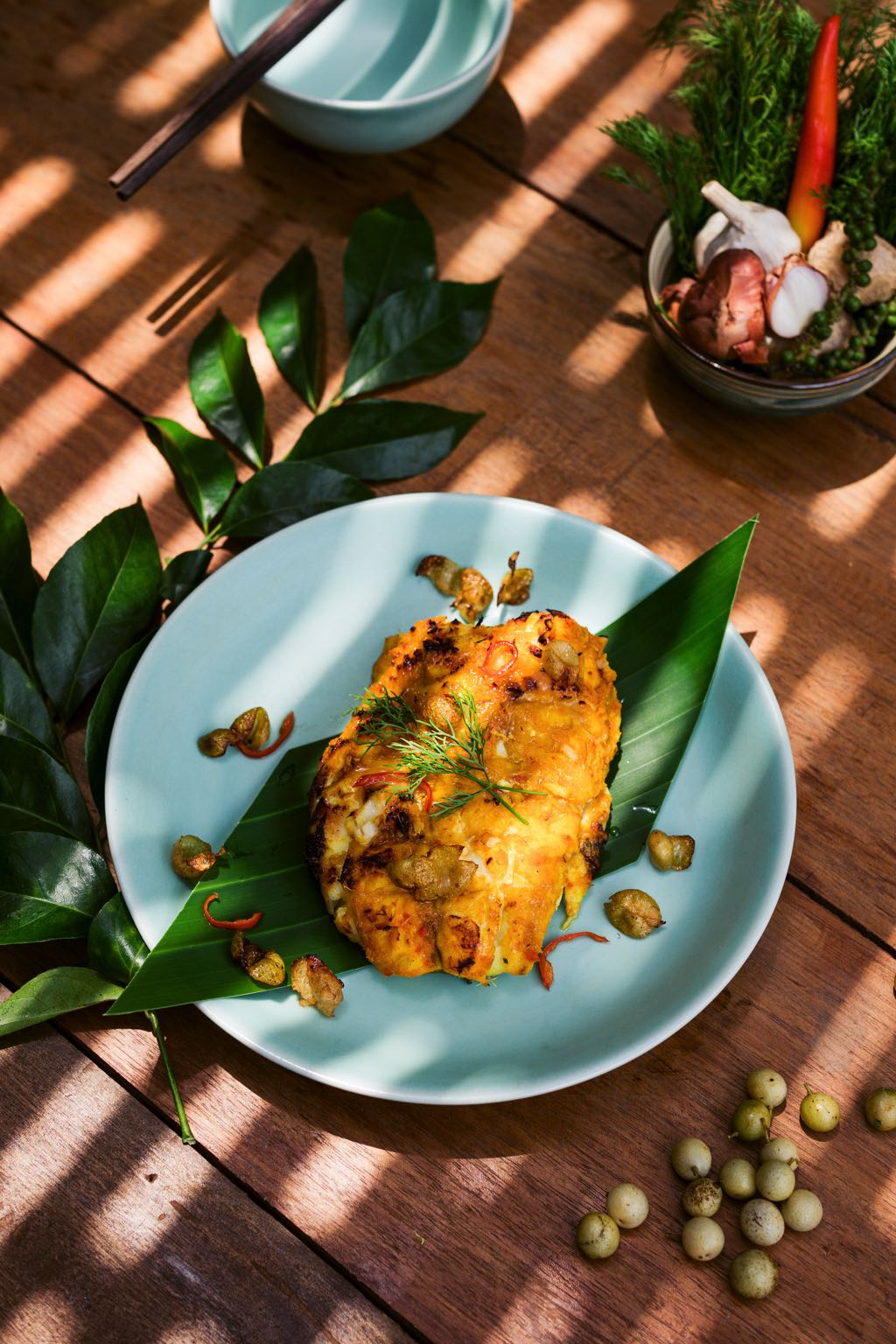 Thick and fatty chopped ribs are used for this dish as lard absorbs and retains the fruit’s aroma. The ribs are marinated overnight in a mix of “mac mat” fruit and spices, then slowly grilled over charcoal. The dish boasts a unique floral aroma from the “mac mat” fruit, the fatty taste of the ribs, and a smoky smell from the charcoal. It is delicious with a handful of mouth-watering sticky rice.