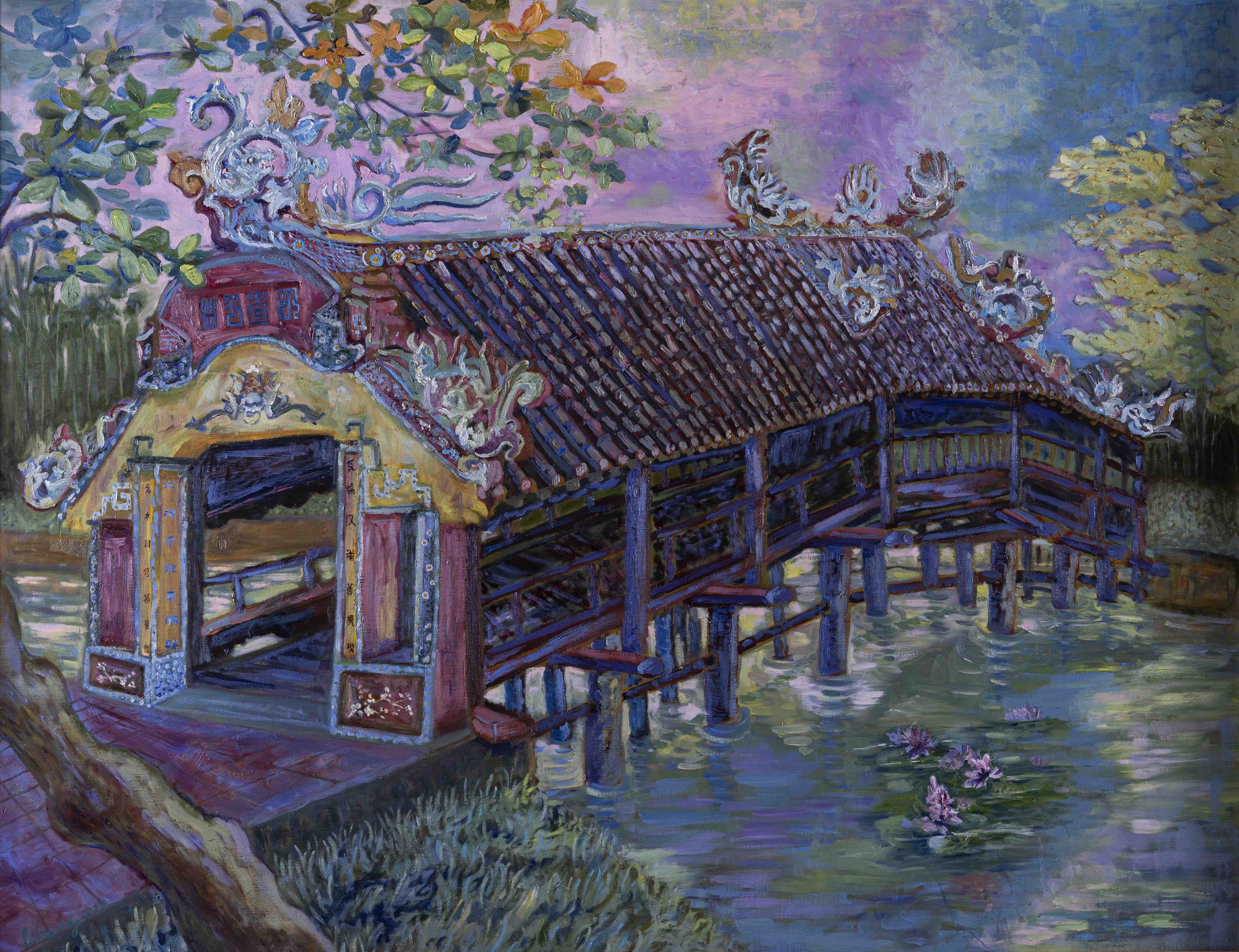 Through her paintings, Le Trang also expresses her nostalgia and pride in the city of Hue. Sunset on Thanh Toan Tile Bridge is one such work. Depicting this ancient bridge, “Le Trang seems to have captured the flow of time by harmoniously combining ancient elements with modern impressions,” said art curator Dot Zhihan Jia.