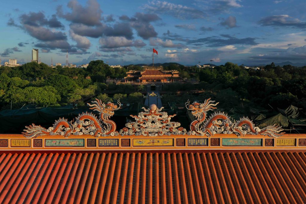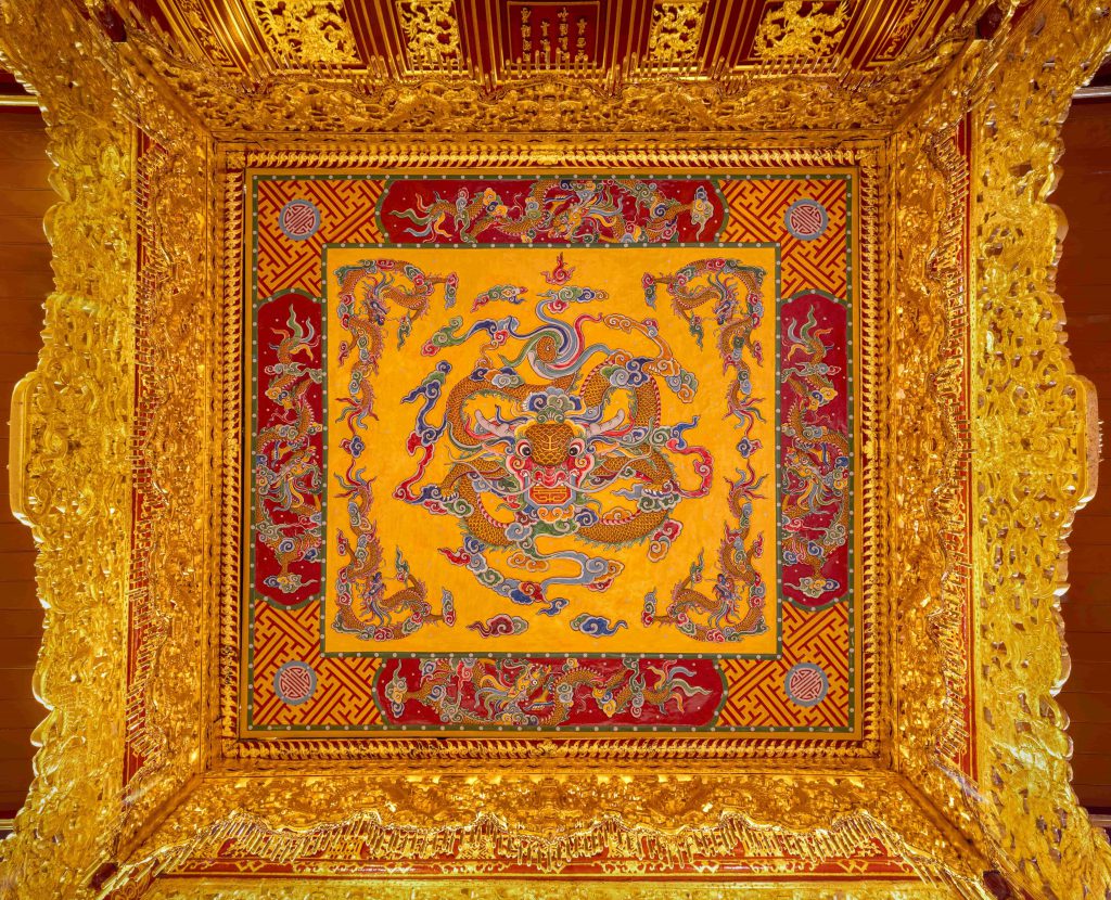 Many will tell you that in Hue the boundary between courtly and folk architecture is thin. This is especially true of gilding. From palace interiors and royal furnishings to the horizontal panels and paired couplets that hang in princes’ residences and officials’ mansions, onward into communal houses and pagodas, and on altars and ritual objects everywhere, you see fine gold lines on scarlet lacquered backgrounds. Come to Hue and stand inside halls whose surfaces were burnished by countless hands. Let yourself be still and feel the space. The palette speaks for itself: red for vital energy and the life-force, gold for nobility and a spirit of liberation. Together, these colors carry an ancient desire to make living spaces brim with vitality. In their glow, we witness a vigorous renaissance of Hue’s heritage today. Thanks to this clear intention, gilded lacquer is not ostentatious, serving to highlight the architecture rather than show off. It is a language of emphasis, not domination, aligning highlights with structure so that beams, brackets, and motifs read cleanly. In a dim hall, gilded lacquer catches the smallest light and returns it as warmth. In bright sun, it holds its dignity, never glaring. To watch the artisans work is to see time made visible: each layer settles, each line breathes, and the final surface seems to glow from within as if polished by memory and air. And shared silence.