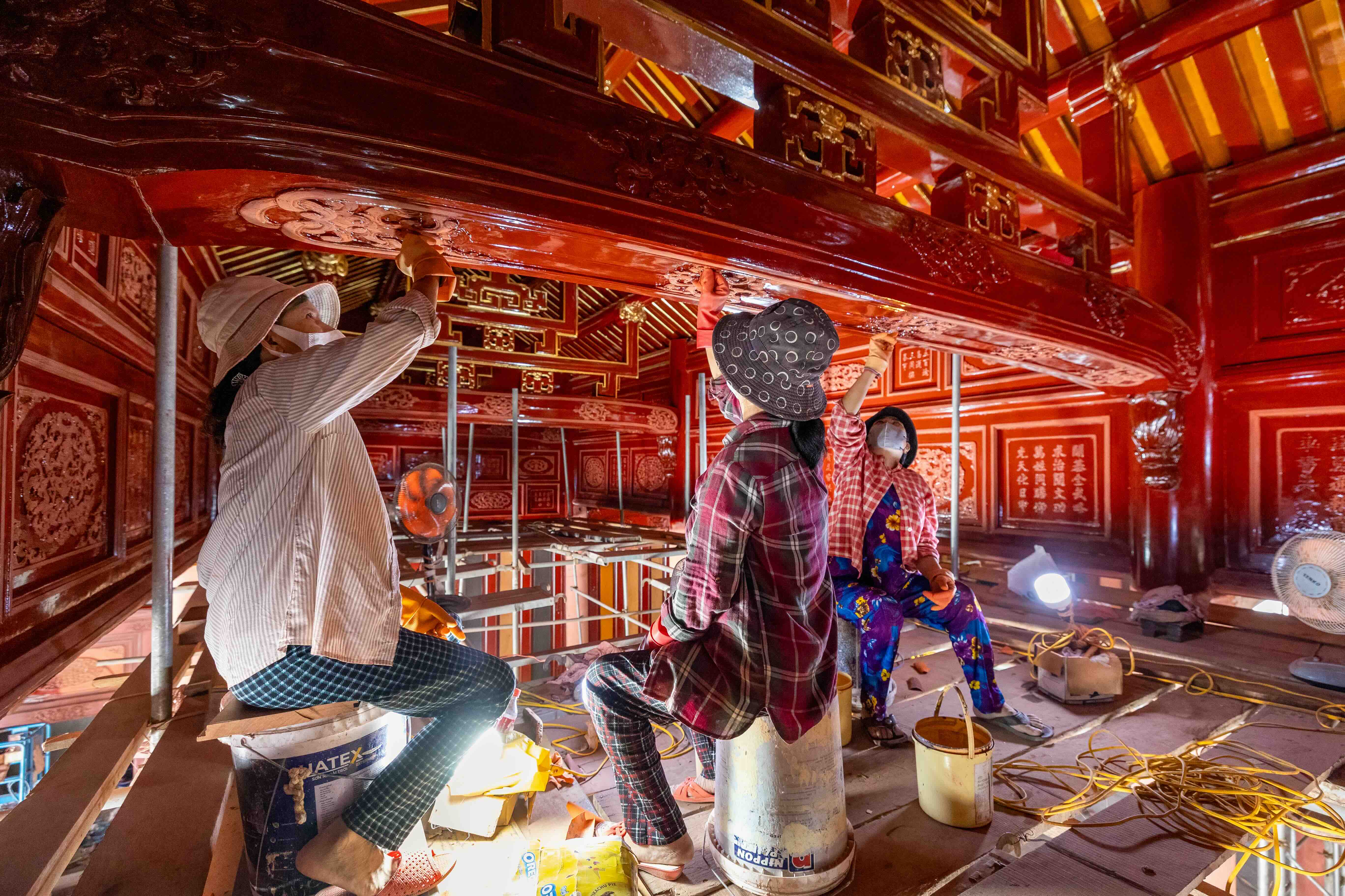 Through various upheavals, the gilders attached to the Tat tuong ty were scattered far and wide. Even so, they taught their craft to their children and preserved this occupation. The recent restoration of Hue’s imperial architecture has called them back to work, reviving techniques handed down through families. Step by careful step, they have returned Hue to its original golden radiance.