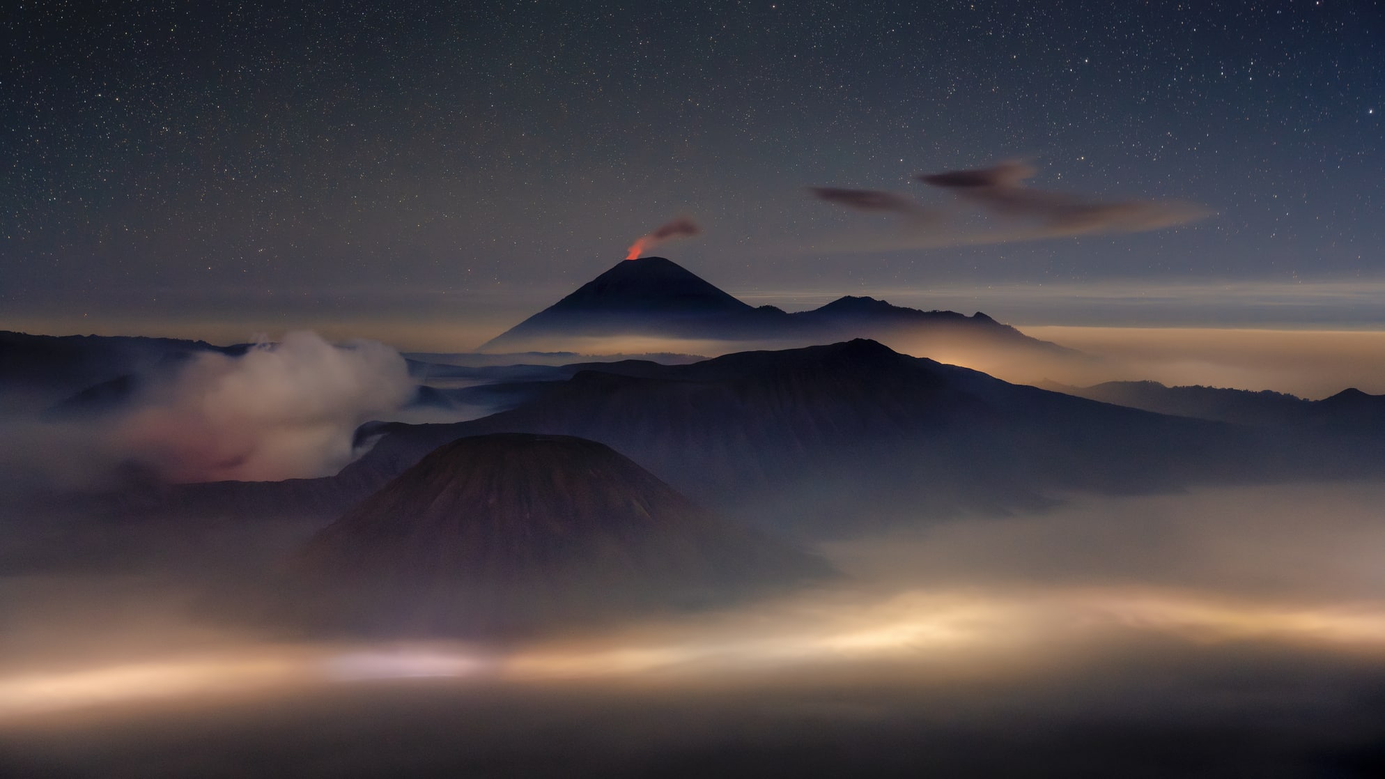 I began my cloud-hunting adventure at 1:30 a.m.. I had to take a special jeep up the mountain and hike a long distance to reach the lookout. At times, I even had to crawl and cling to trees in order to climb the steep, sandy slope. From that viewpoint, I gazed out at a vast expanse before me. The Tengger mountain range loomed in the misty distance. Occasionally, a column of grey smoke rose into the sky.