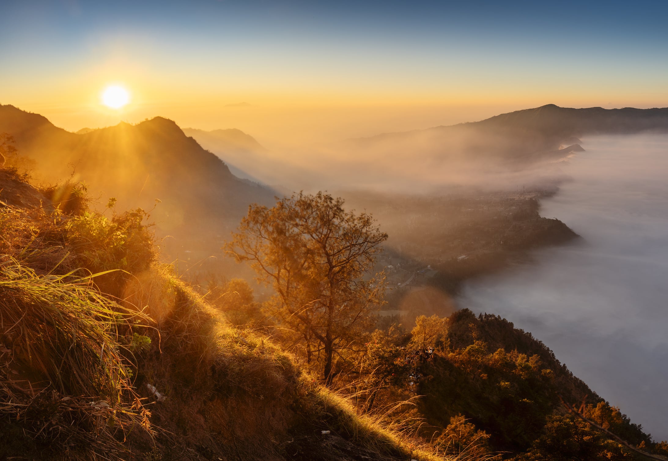 Indonesia has two seasons: the wet season and the dry season. With heavy rains, the wet season can be unpleasant, as it can rain for months on end. The dry season, which lasts from May to October, is better for tourists but can be quite sunny. The scorching sun can be a challenge when exploring this region. Although it’s hot during the day, the temperature drops at night and can even get cold. Fortunately, I visited Mount Bromo during the dry season when there was a full moon. The moon shone brightly, illuminating the entire landscape. Stars filled the sky, which looked mysterious and otherworldly. On the morning I visited, I was especially lucky, since low clouds drifted in, forming a swirling stream below me in the valley at the foot of the mountain. The peaks of distant mountains loomed up, adding to the ambiance.