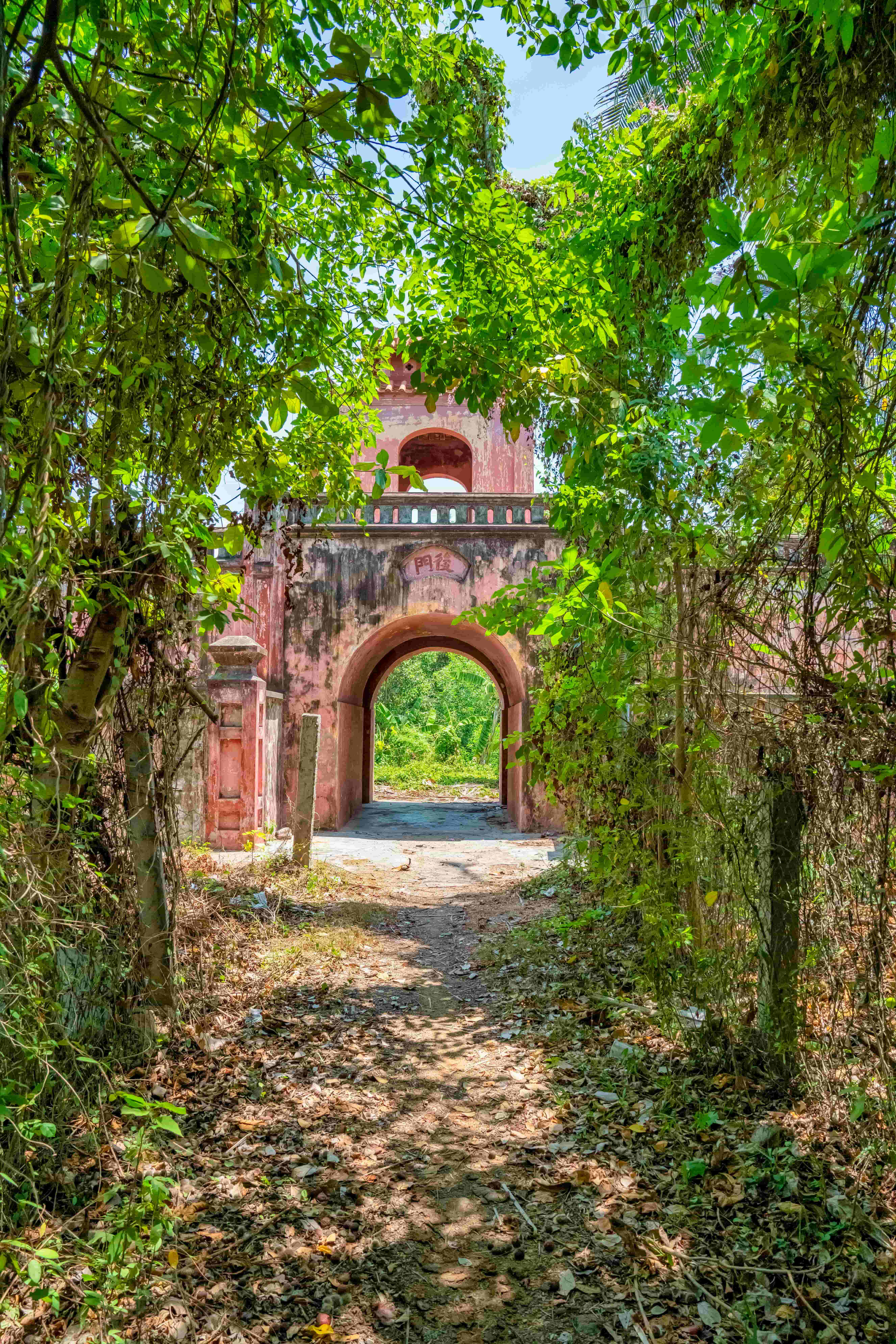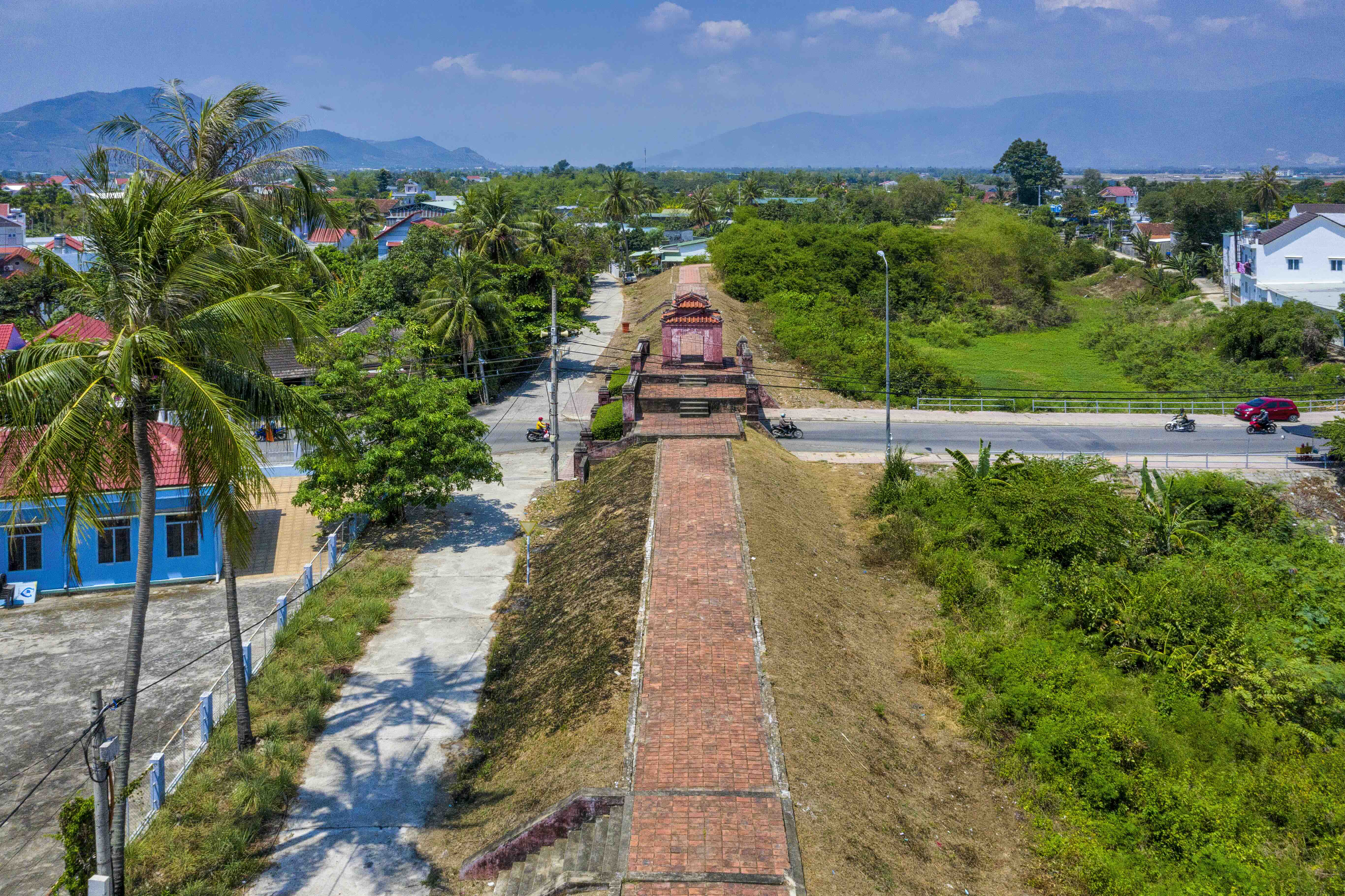 Dien Khanh Citadel was laid out in the shape of an irregular hexagon. Its ramparts were earthen embankments reinforced with thorny bamboo for greater strength. The gates were arched brick-and-lime structures, each topped with a square watchtower roofed in interlocking yin-yang tiles, once used for observation. Each gate complex covers an area about three meters wide and 15 meters long, with stairways on both sides for access. From the surviving sections of rampart, the walls are estimated to have stood about three meters high, with a crest approximately five meters wide.