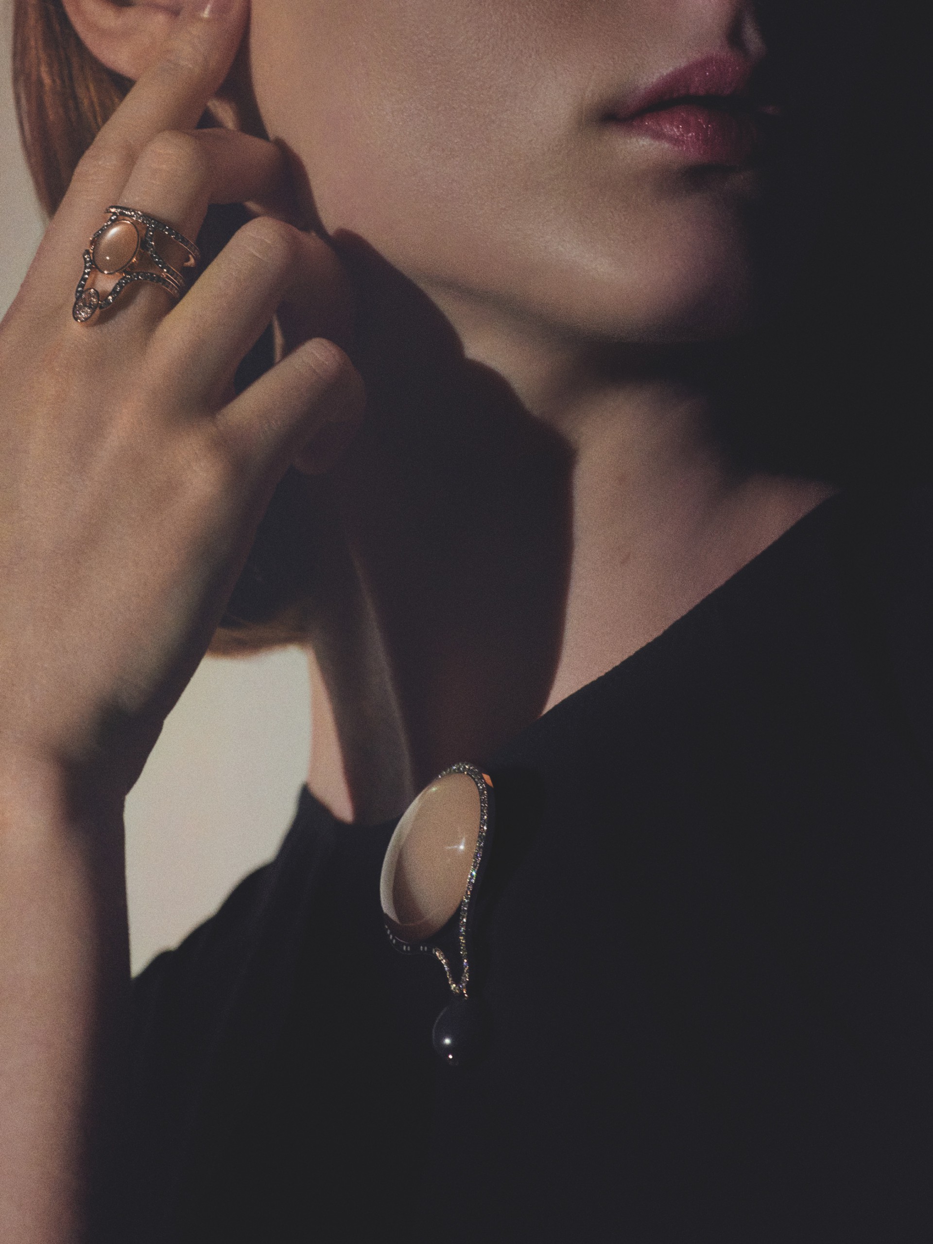 This train of thought culminated in Hardy’s decision to reconstruct the mysterious cycle of life hidden within each body through closely associated objects. For instance, his necklace was inspired by the stethoscope, which allowsdoctors to tune in to our every heartbeat and breath. Yet its headset, tubing, and diaphragm represented a gateway for a body to communicate its vitality to the world outside where gold, diamonds and precious gems were taking form, ready to serve Hardy’s relentless pursuit of beauty.