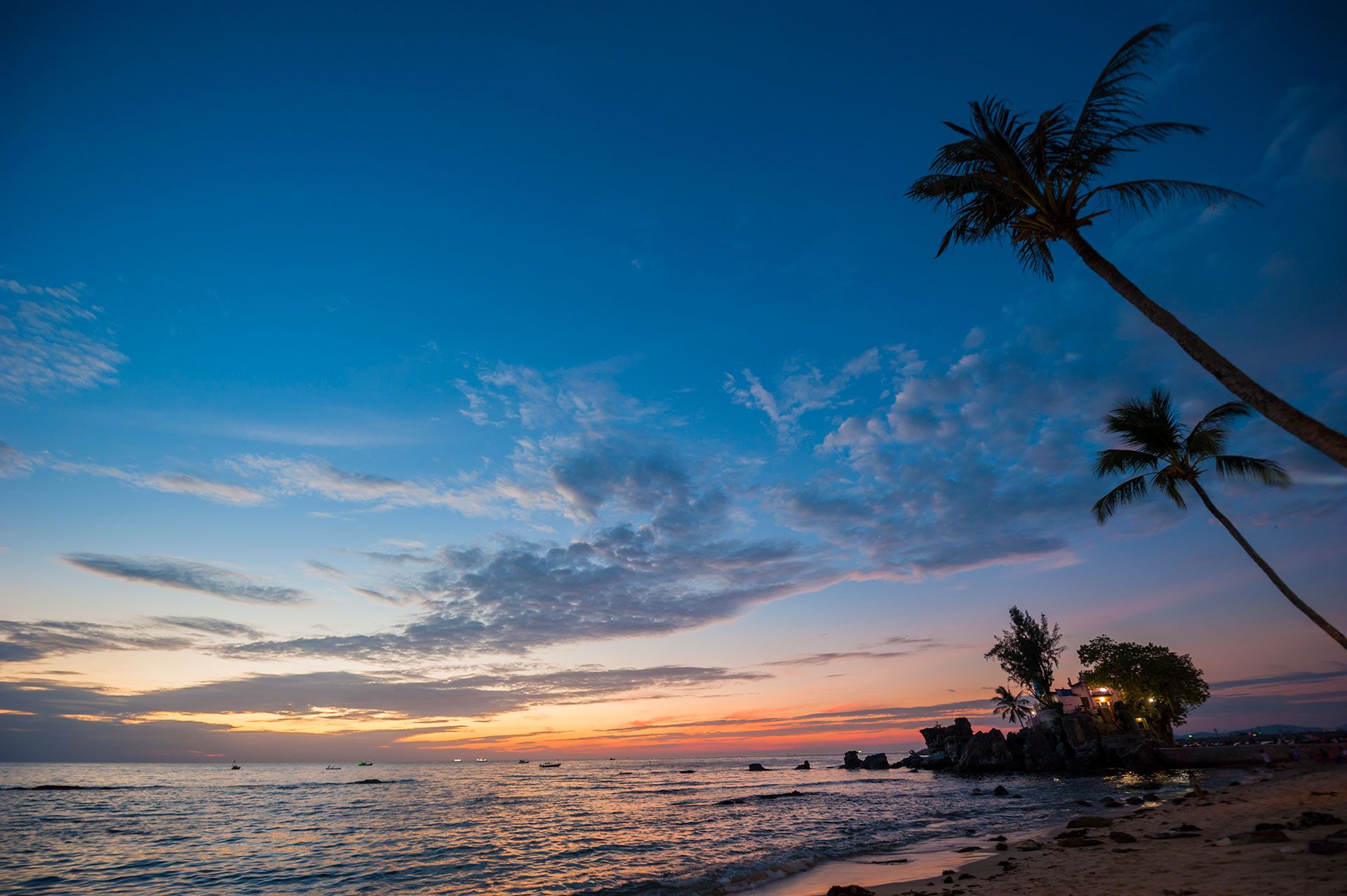 Pilgrims climb 29 steps cut into the rocks to reach Dinh Cau Shrine, which affords a fine view of the area. Seen from this height, the windswept island appears calm and mysterious, with frothy waves rising beneath a purple sunset.