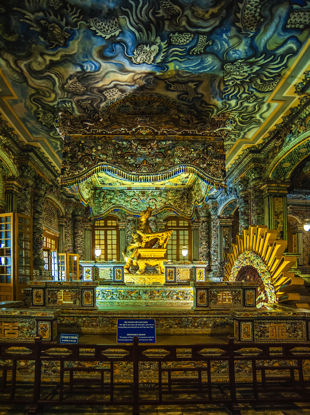 Mosaics are used as interior decorations in Thien Dinh Palace, home to Khai Thanh Hall and the grave of the emperor, where his statue stands. Hundreds of pieces of broken porcelain and stained glass were subtly combined in the recesses of the altar, the columns, and the walls.