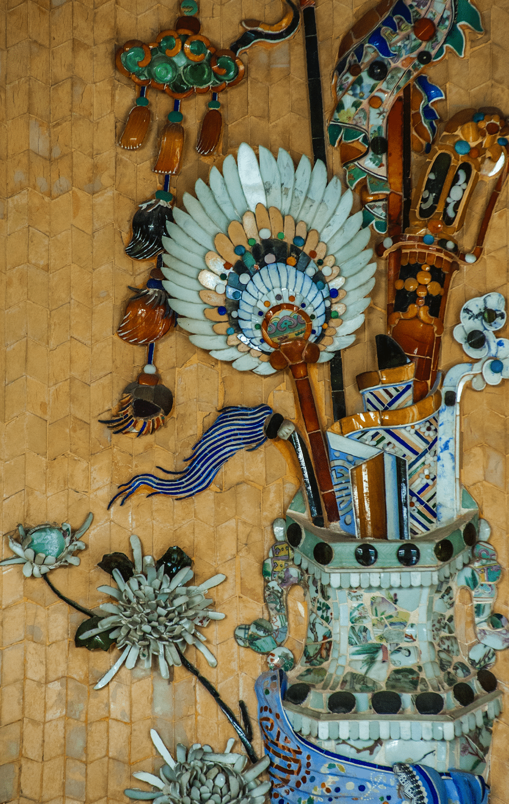 Made of porcelain, glass, and stone, these decorative mosaics contain many traditional cultural elements that explore themes familiar to Vietnamese society at that time. These mosaics are quite similar to folk paintings in the topics they cover and their color combinations, which may sometimes seem flashy.