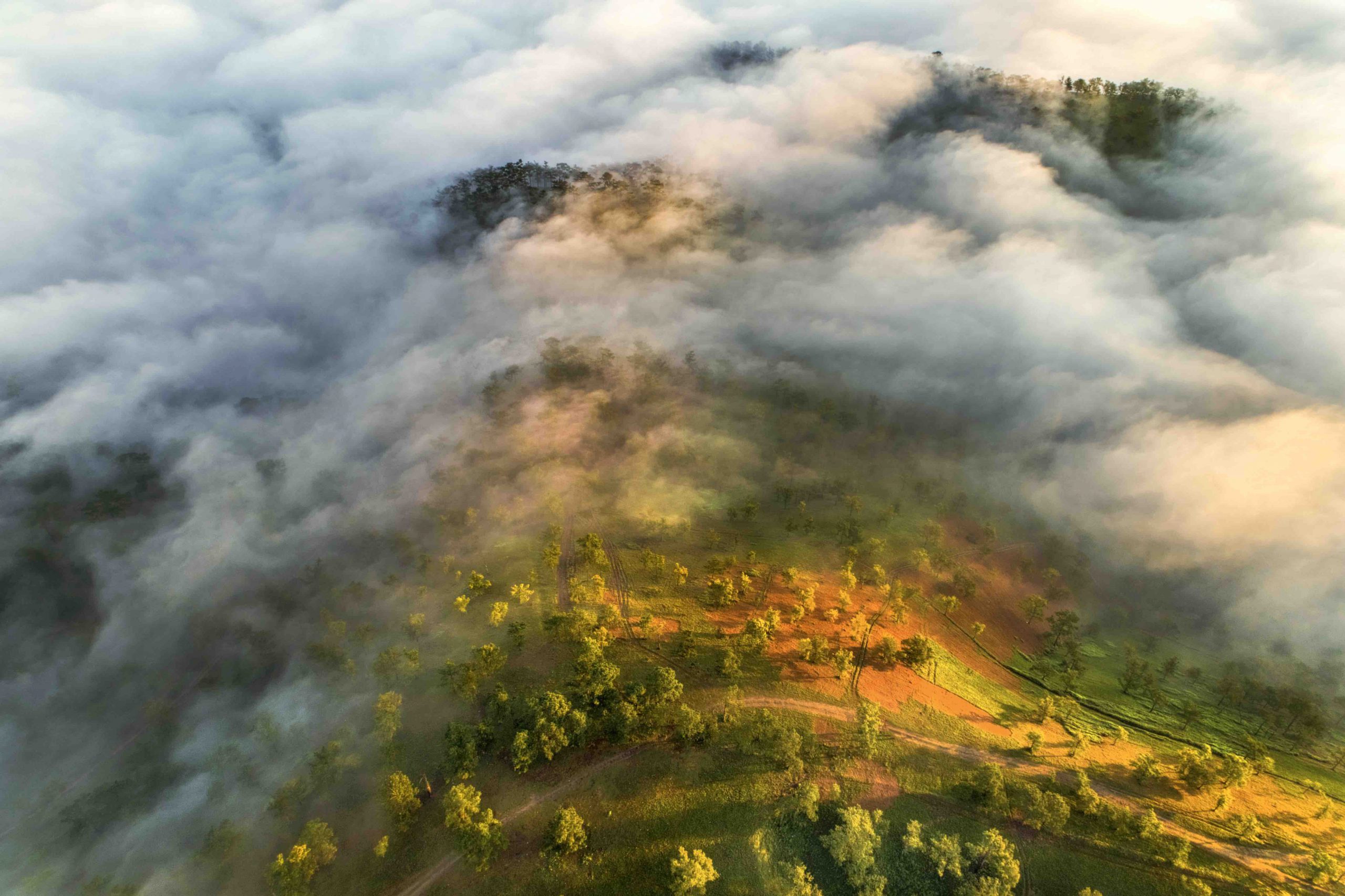 As the sun rose higher through this ocean of clouds, its light filtered down on the vast pine forests below, creating magical rays reminiscent of fairies brushing their hair in the morning light.