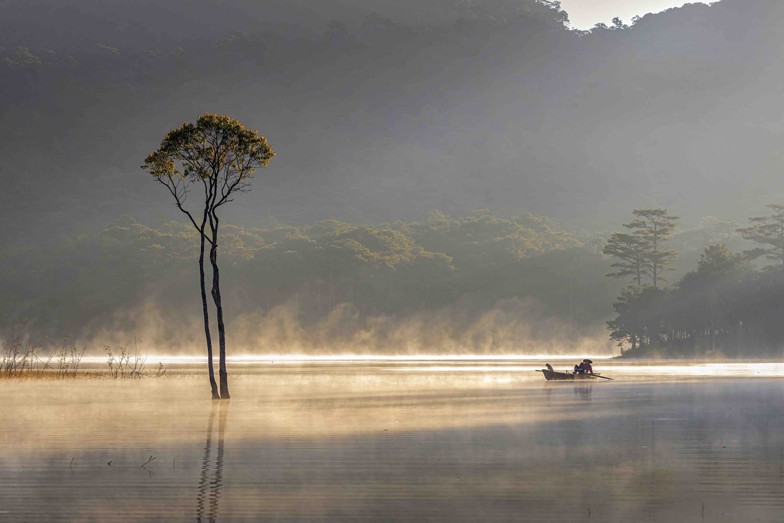 A unique feature of Tuyen Lam Lake is the swampy cajuput forest along Tia Stream—the only tropical rainforest submerged in freshwater in Dalat. Encircled by pine forests on the slopes of the surrounding mountains, Tia Stream feels like a world of its own: serene and captivating. In the early morning chill, a curtain of mist blankets the entire area. Occasionally, a gentle breeze lifts this veil of fog, revealing cajuput trees with their slender branches—budding with fresh green shoots—rising from the jade-green waters. The scene resembles an ethereal watercolor painting.