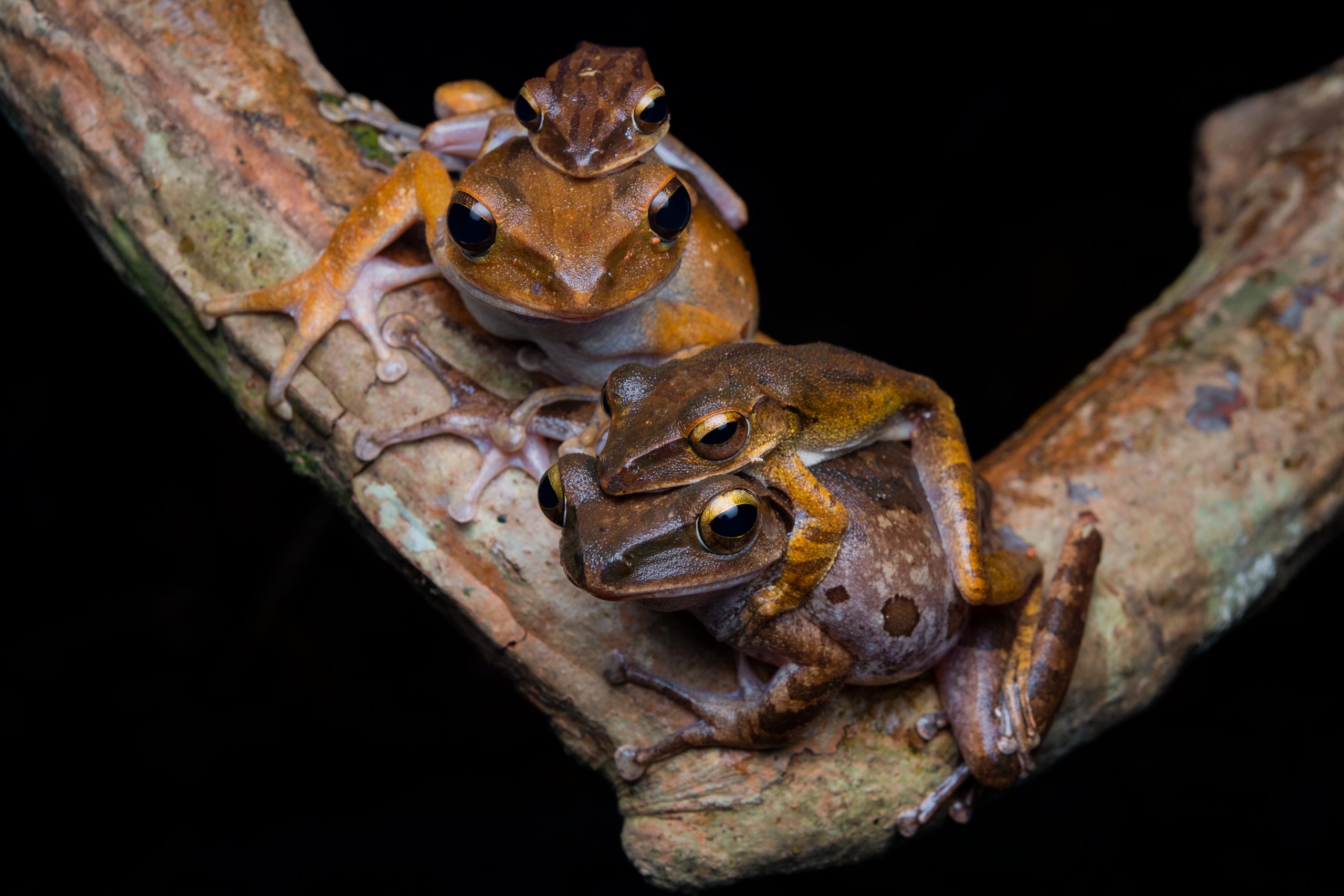 By the stream, a few stagnant ponds that have yet to be filled by the rushing currents become ideal environments for tadpoles to thrive. Various frog species gather to mate and lay eggs. Unlike the noisy and hurried four-lined tree frogs, Helen’s tree frogs meticulously select high branches extending over the center of the ponds. They lay their eggs on leaves, waiting for the moment the tadpoles hatch and fall into the water, thus completing a secure reproduction process.