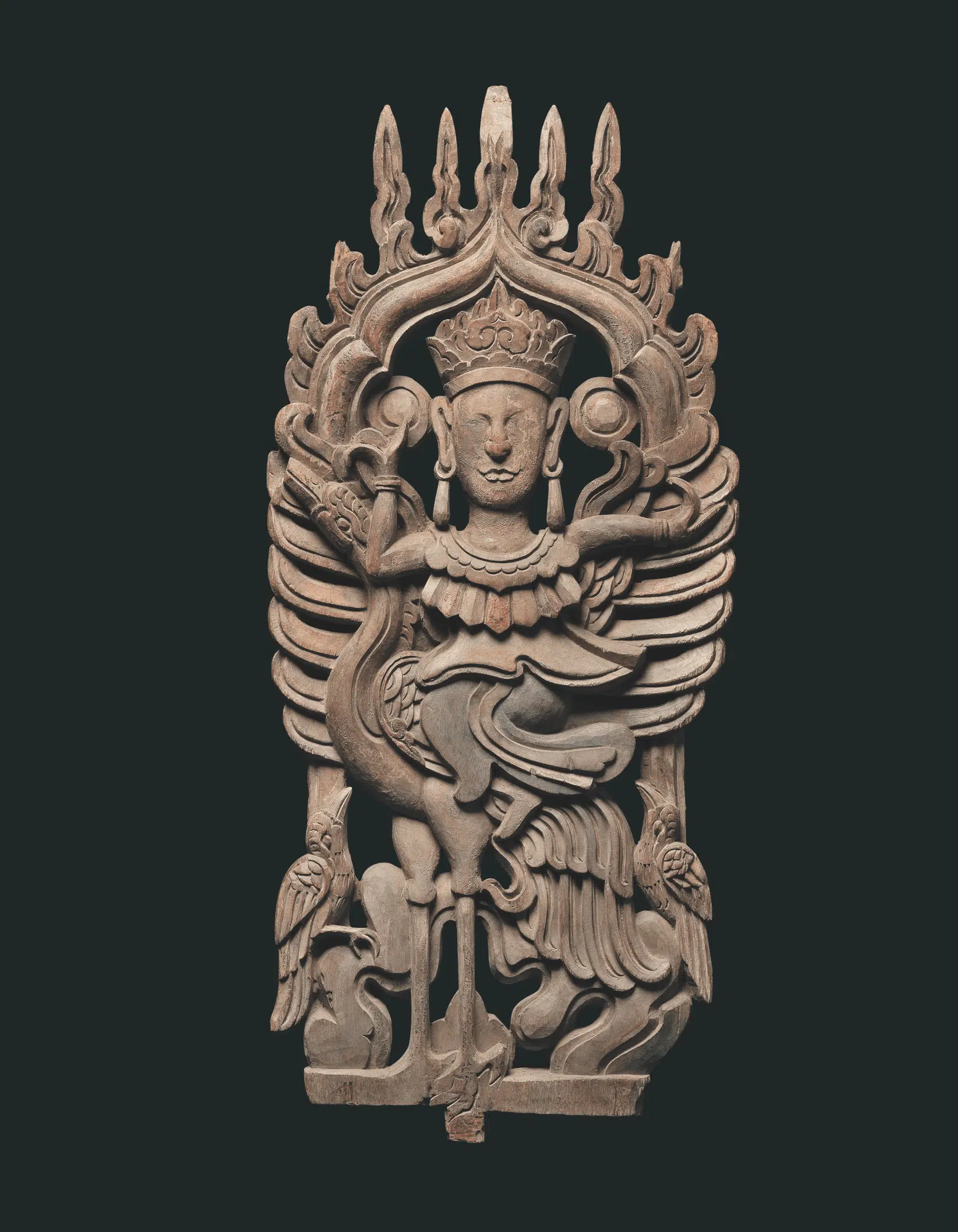 Apart from the Four Sacred Animals, Vietnamese people recognise other sacred animals including Sau, Winged Horse, Garuda, Dragon-transforming-into-a-fish, Dragon Horse, Pulao Dragon and Si Van Dragon Fish, etc. These fictional sacred animals feature one or more body parts of real animals. Unique to Vietnam, the Sấu has a lion’s head, a weasel’s body and a squirrel’s tail and is usually laid on steep doorsteps of pagodas or towers. Winged horses, or Pegasus, are mythological creatures in Western cultures that were adopted in Vietnam in the 15th century when they were depicted on ceramics ordered by foreign merchants for export. Garuda are sacred birds that originated in India and are frequently depicted as human birds. In Vietnamese Buddhist arts, Garuda are mascots that stand guard at the corners of towers or altars or on the gables of pagodas. The Garuda reveals cultural exchange between the Dai Viet and Champa. Dragon-transforming-into-fish are associated with the Confucian legend “Fish overcoming the Heavenly Gate”. This legend advises scholars that perseverance and diligence can pay off.