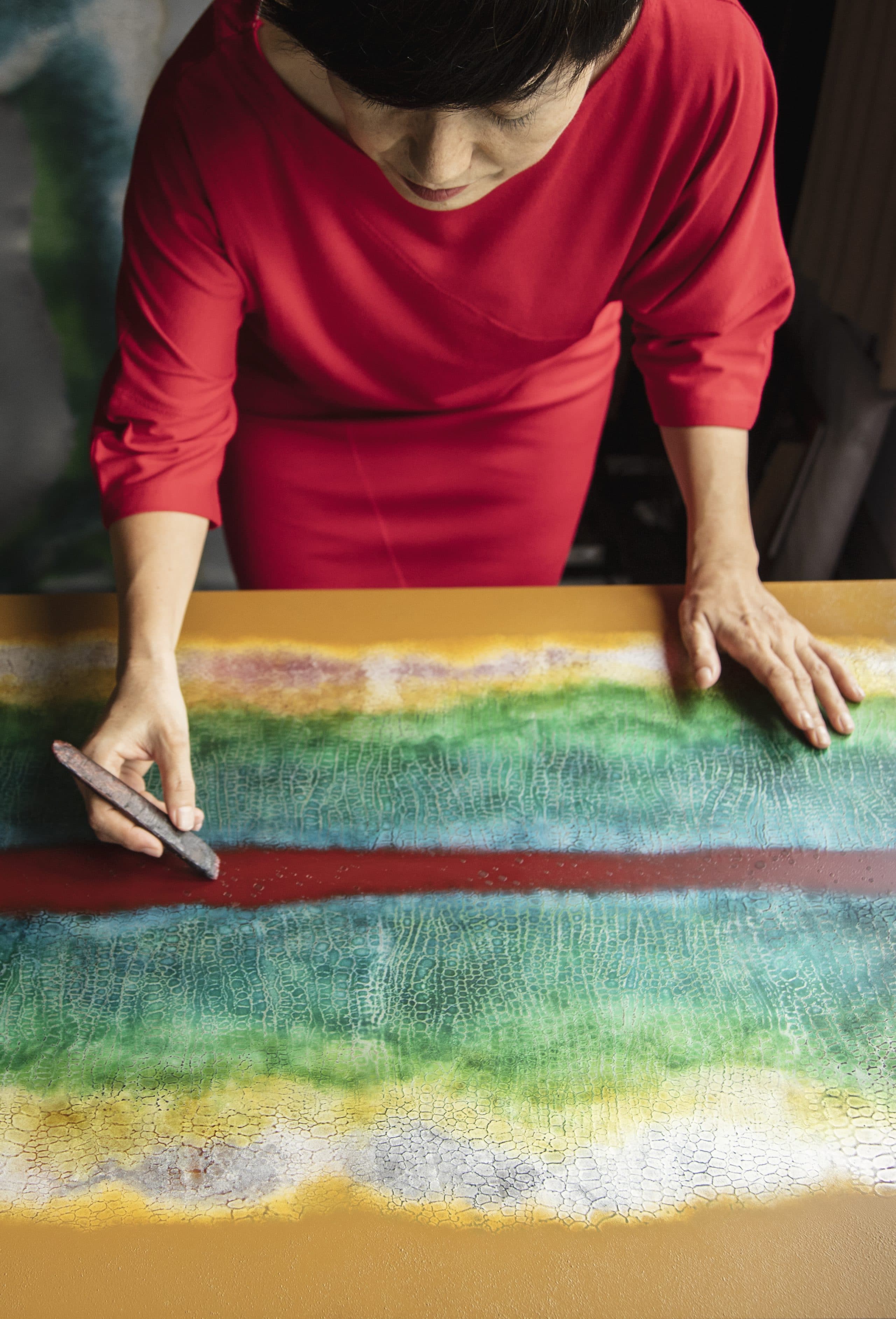 Saeko Ando: With most materials, for example oil or watercolors, you start with the big picture, then move to details. Lacquer is the opposite. You must plan ahead and remember each step. It’s an intellectual game and a mix of science and art. Natural lacquer is a living medium that contains enzymes and responds to heat, humidity, other materials, and manipulation. I often feel more like a scientist inventing something.