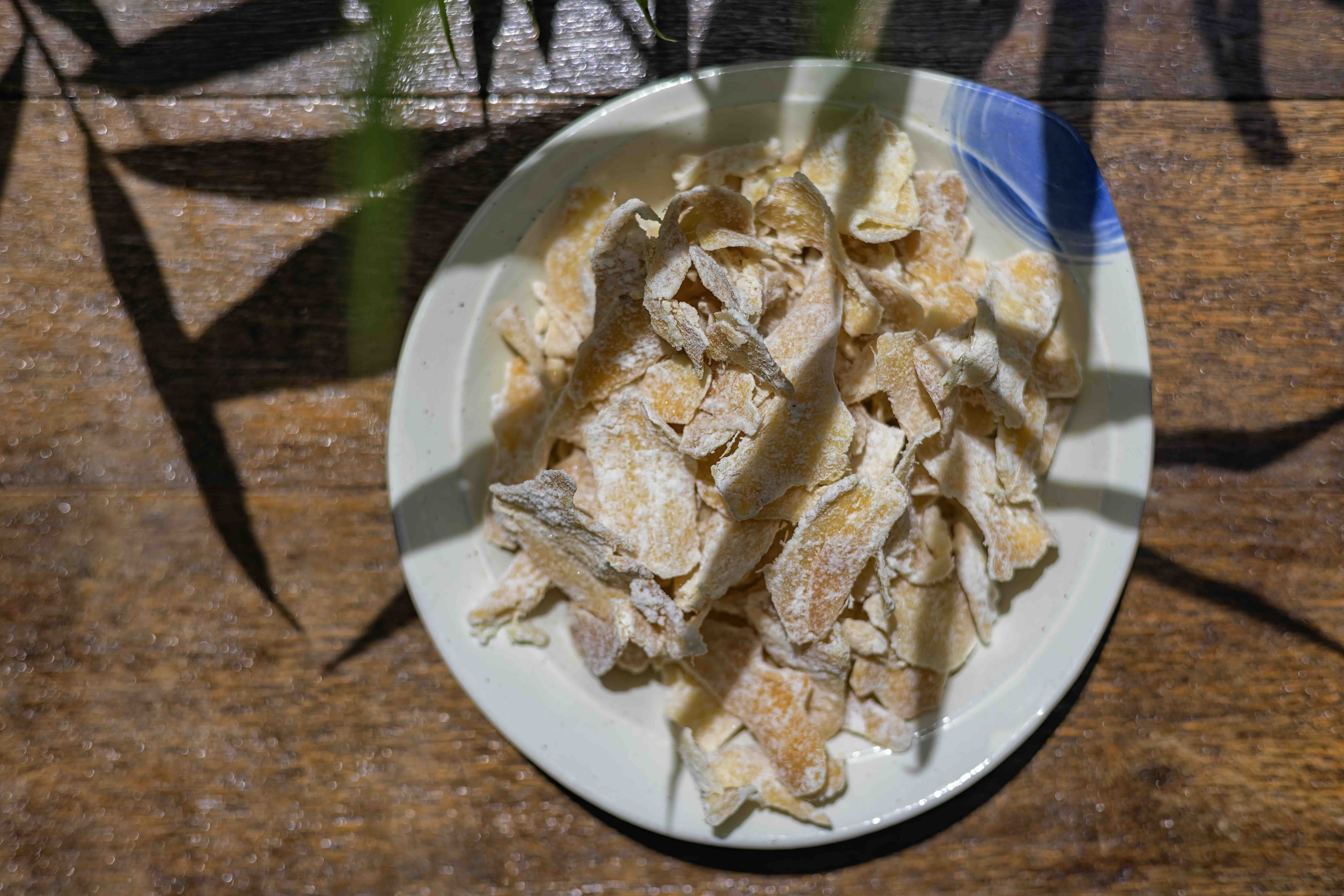 In the cool air of early spring, candied ginger is an essential holiday treat. Thin slices of young ginger are blanched to tame the spiciness, simmered with sugar over charcoal until golden and glossy, and coated with a delicate dusting of crystallized sugar. Sweet, spicy, and warming, candied ginger pairs perfectly with a cup of tea during the first days of the year.