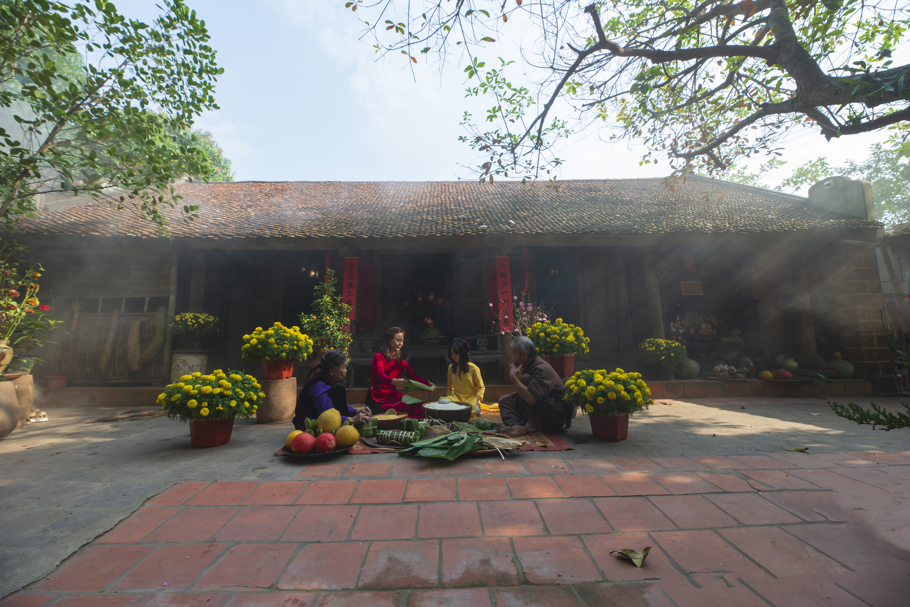 As each person prepares for Tet, they express their artistic spirit. This has been true since the time when each family adorned their homes with simple Dong Ho folk paintings that symbolized wealth, luck, and prosperity, or with vases of modest flowers like daisies and violets. On the altar, there would be a tray of common fruit, such as bunches of green bananas, golden pomelos, and clusters of orange-red kumquats, accompanied by a plate of fresh betel and areca nuts, a simple box of sweets amidst the light scent of incense and the sweet and gentle aroma of traditional herbal bath-leaves, used for end-of-year bathing, emanating from the kitchen. There wasn’t much, nor was it very luxurious. Yet the simplicity of the old times still has its charm today, as the trend to revive traditional Tet customs makes these old-fashioned items sought after. Many people are even eager to prepare Chung cakes, eagerly gathering with family and friends.