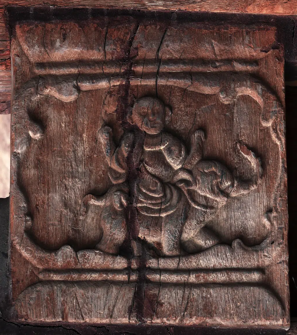 Hoang Xa Titular Temple (Hanoi) boasts some unique images, including three bas-reliefs of “Elephant riders” on a beam and a relief titled “The emperor plowing furrows with an elephant”. Doan Xa Titular Temple (Ung Hoa, Hanoi) and Gie Ha Titular Temple (Phu Xuyen) both have “Elephant riders” reliefs on their beams. Chay Titular Temple (Ha Nam) has a wide range of wooden elephant sculptures, including sophisticated reliefs such as “An elephant rider staving off a tiger”, “The tamer of elephants and horses”. Perhaps the most outstanding artwork is the relief “Puxian Samantabhadra on elephant back” in Kim Hoang Titular Temple (Hanoi). Another surprising relief is “Elephant race” in Nghe Giam Temple (Cam Giang, Hai Duong), which depicts elephant handlers poking elephants’ heads with poles to make them run faster. This relief has been replicated in plaster and is on display at the Vietnam Museum of Fine Arts.