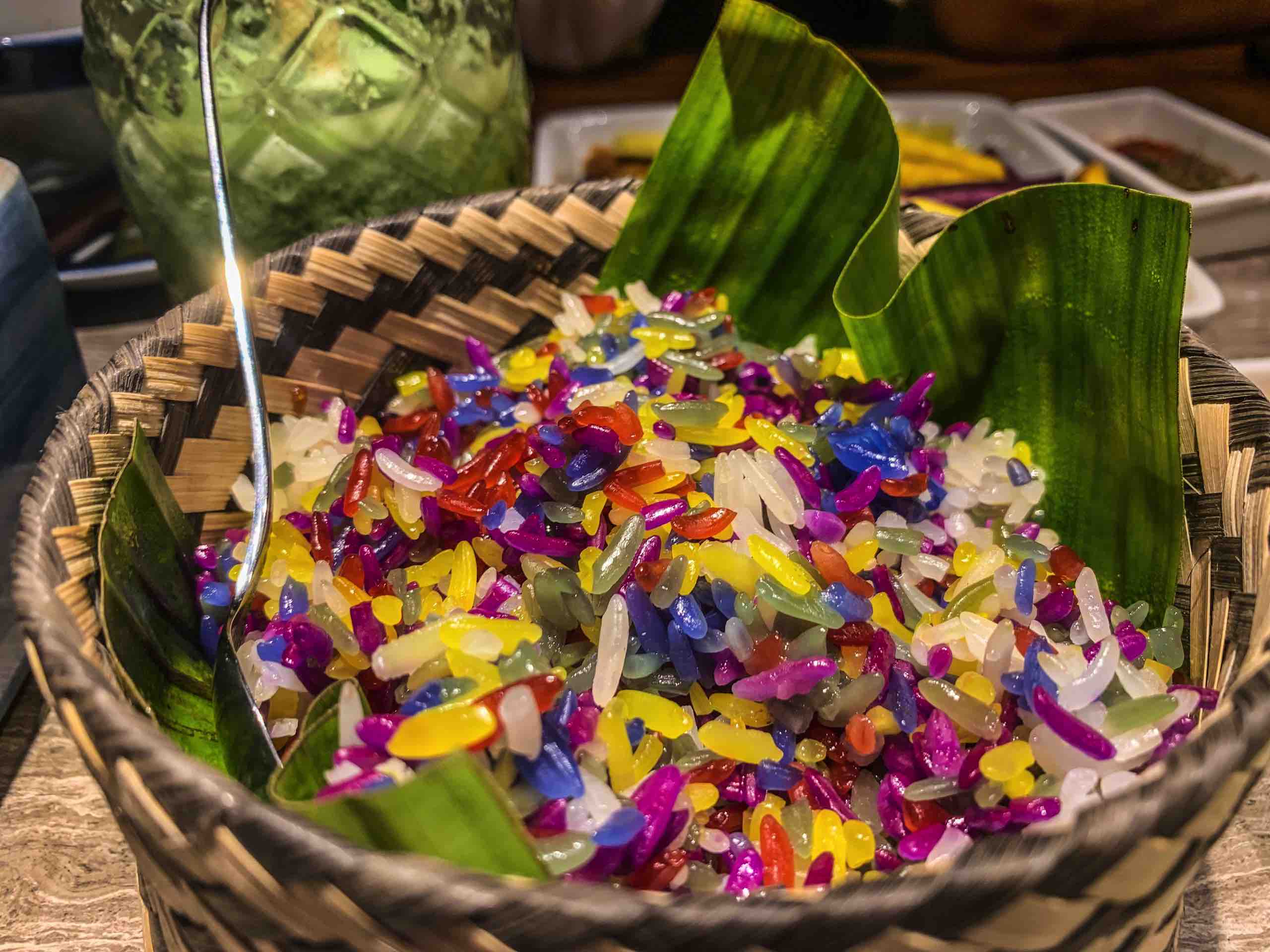 Together, the trio introduced us to various unique dishes, such as savory lạp (buffalo skin salad) with pickled bamboo shoots and the deliciously seasoned pa pỉnh tộp (grilled fish) – both recipes of Thai people in the Northwestern region. There was also buffalo jerky with charcoal-grilled chitterlings that smelled and tasted delightful, and five-colored sticky rice made from Lao Cai’s aromatic glutinous rice.