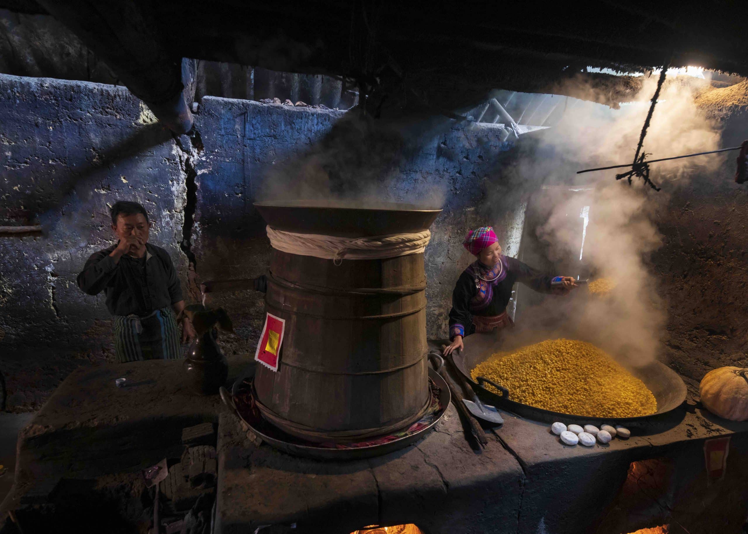 To make corn wine, the first step is to soak clean yellow corn kernels for about 20 to 24 hours. A large pan is placed over a charcoal fire that’s burning just enough to make the corn simmer in the pan. The cook must stir the corn often and add water. When the corn kernels are fully popped, they are scooped out to dry on a flat bamboo tray or mat. Once cool, they are mixed with the yeast. The yeast-making and incubation stages are very important. The hong mi seeds are put into a stone mortar, ground into a powder, filtered to make flour, kneaded with water, and shaped into cakes. The yeast cakes are placed on straw and dried in an airy place with little sunlight. When the yeast dries and turns white, it is ready. After the dried corn has cooled, the yeast cakes are crumbled into powder, sprinkled on the corn, and mixed evenly in a ratio of three yeast cakes for 10kg of corn. The corn mixed with yeast is put in a wooden barrel and placed in a cool, airy place for around five to seven days until it ferments.