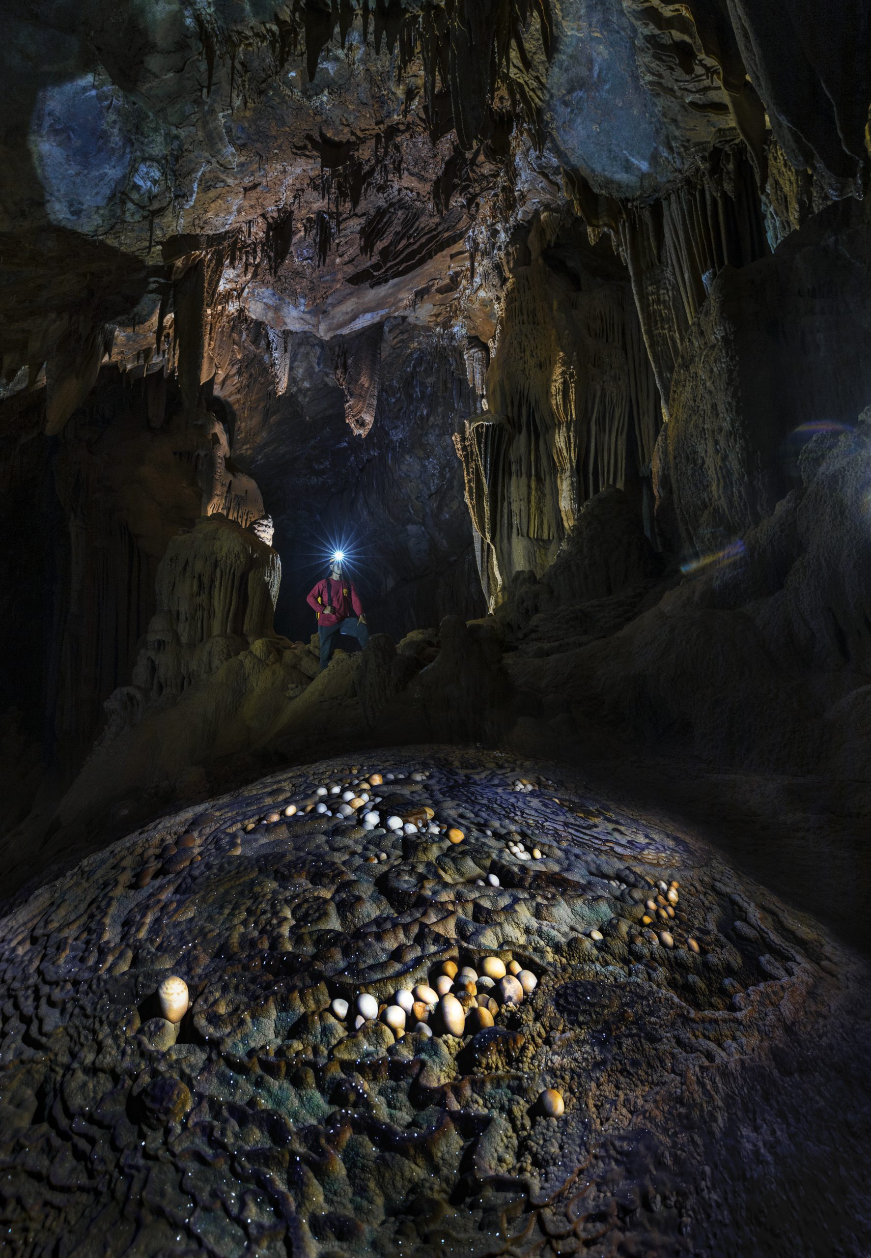 What struck us most was the system of crystal straw stalactite, which grow slowly but constantly with every second and minute. At the top of each emulsion tube there’s always a drop of water, clear and pure as a pearl. This was also the first time I laid eyes on such a smooth tray of ‘jade caves’. Typically spherical like eggs of many sizes, these ‘jade caves’ form as water crystallizes, causing them to grow and rotate simultaneously.