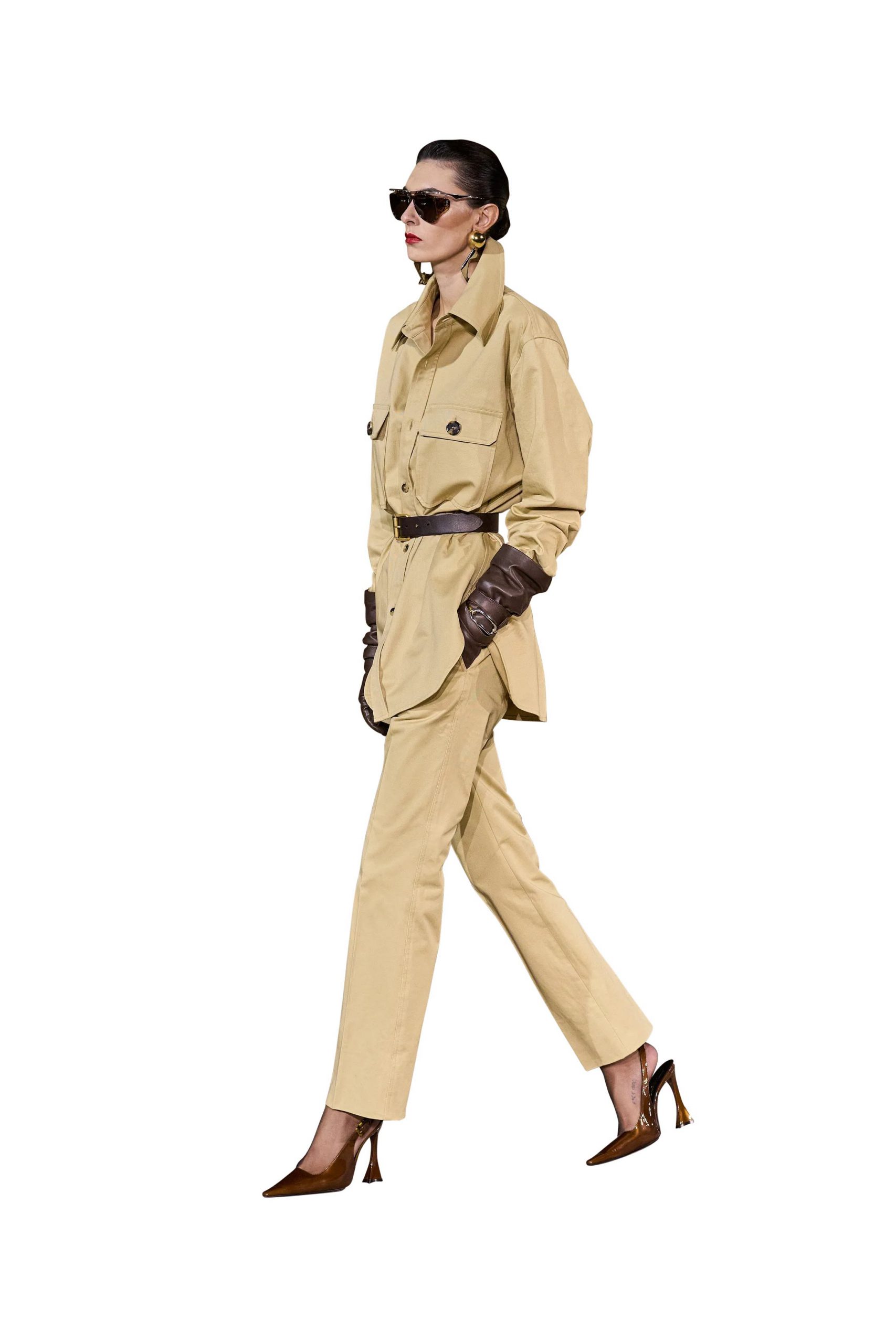 One notable collaboration between Stone Island and rapper Drake produced chunky sweaters, delivery worker pants and bomber jackets that are constantly selling out. Not only stylish, the designs are made from sturdy and long-lasting materials like thick denim, wool and cotton. Meanwhile, Pharrell Williams at Louis Vuitton struck a chord with overalls and work jackets made from high-end tailoring fabrics. In a more refined version, Fendi’s silk cargo pants and Saint Laurent’s khaki and army green jumpsuits for Spring 2024 interpret a fashionably ready-to-work attitude.