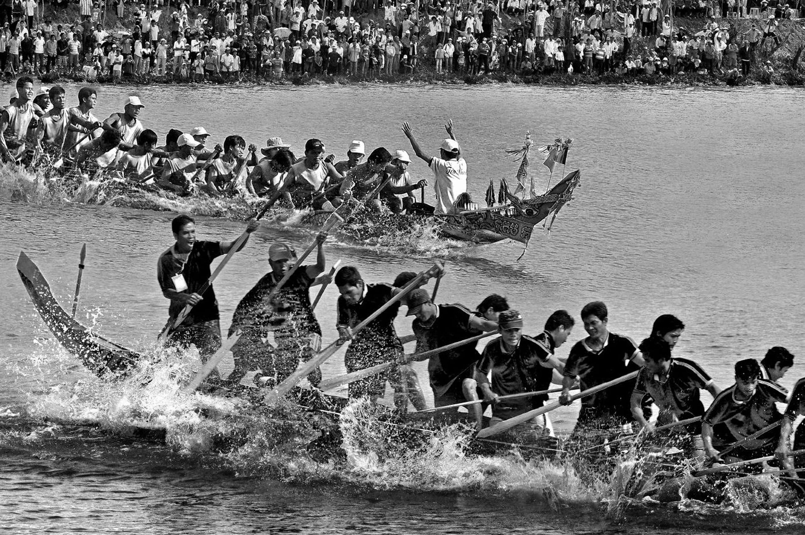 Team members include Mr. Order (the Commander), Mr. Crutch (the Sustainer), Mr. Flag (the Signifier), Mr. Wooden Fish (the Rhythm-maker) and Mr. Rider (the Guide). The number of rowers varies. In Hanh Thien’s Keo Pagoda boat race, each boat holds 10 rowers. There are 18 rows in the Dam race, 24 in Bach Hac and 36 in Dang. The Khmer boats can accommodate up to 60 rowers. Regardless of the particulars, each festival promotes teamwork and community spirit.