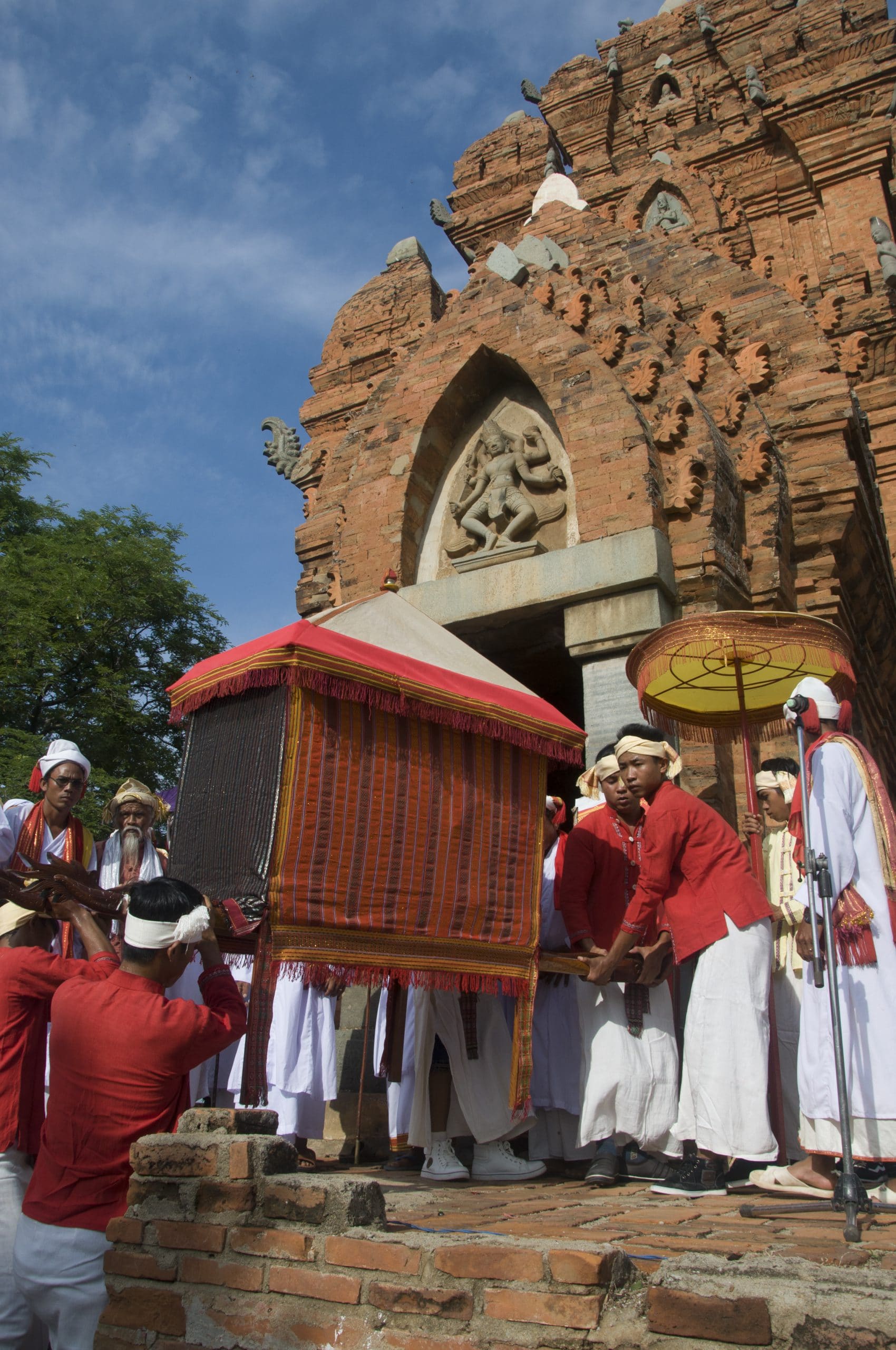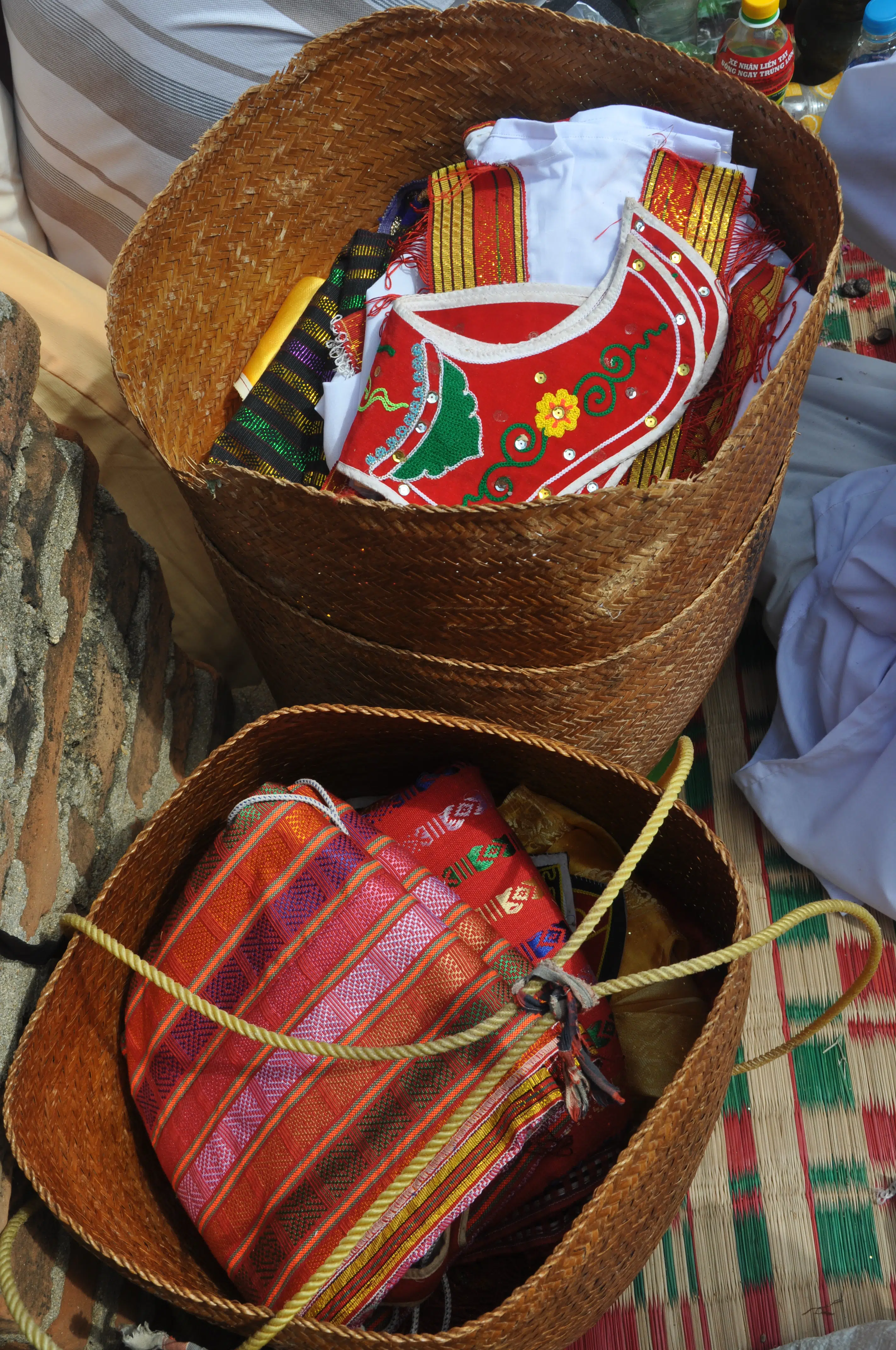 Most of the costumes of Cham monarchs are carefully preserved by the Raglai locals. By the dedication day of a goddess or monarch, a costume procession must be made by the Chams from the Raglai back to their villages. Raglai will join the Chams in carrying these costumes to temples in these villages and to sacred towers such as Po Klaong Garai and Po Rome. As legend has it, the people of Champa and Raglai were sisters, with Chams the elder and Raglai the younger. In the matriarchal hierarchy, the youngest daughter who inherits wealth is responsible for ancestral sacrifices, so Raglai people are supposed to preserve costumes of Champa gods and kings. Costumes of a Champa king are classified in types, placed in many rattan baskets and arranged in a palanquin covered in a colorful shroud that boasts eye-catching prints, colors and decorative patterns.