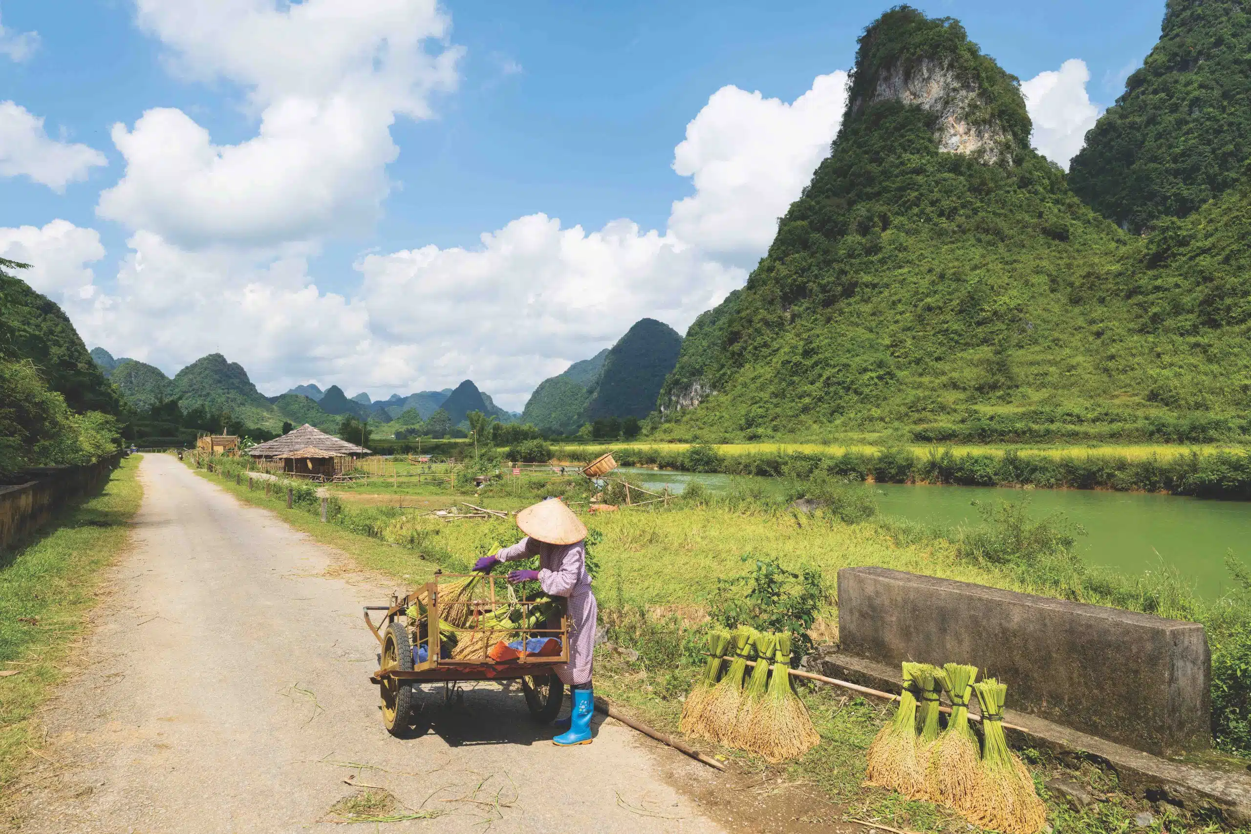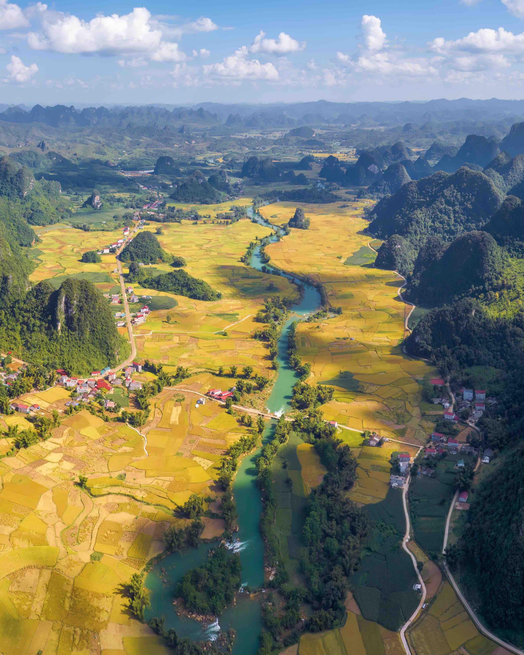 The river’s silt-laden waters weave a tapestry of transformation along its banks. In some places, the emerald green water is calm and contemplative as it winds around towering cliffs. In others, it is gentle and soft under lush green bamboo groves. In some stretches, the river flows like a soft veil through vast golden rice fields.