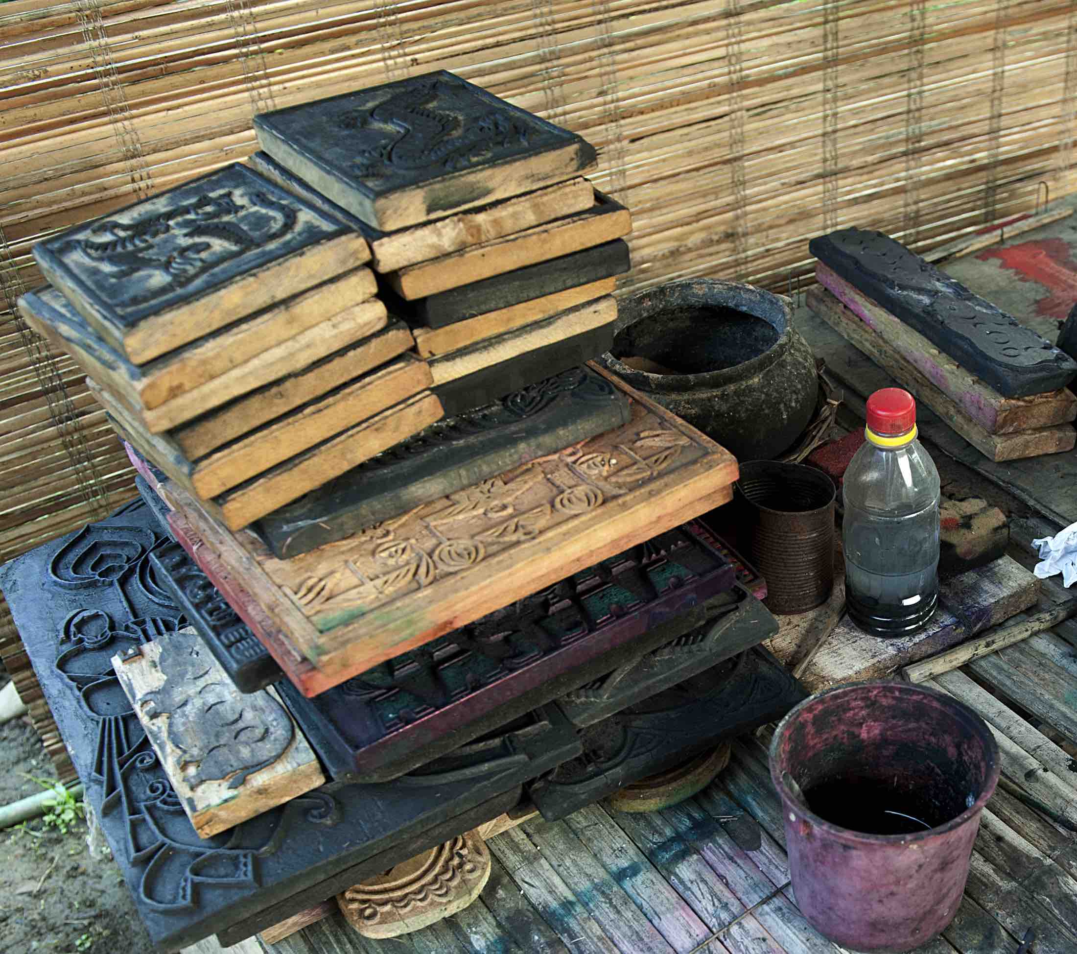 Since this craft is time-consuming and hard to learn, today, it is being practiced by fewer families in Sinh Village. Like everything else, the process has changed. In the past, colors were mixed from natural pigments. Dung leaves were mixed with hoe buds to create light yellow. Malaba spinach was used to make green. Hoe seeds created orange. Bang leaves were used to make red. And ash mixed with boiled well water was used to make black. Today, chemical pigments are used. Machine-made paper has replaced handmade do paper, except for special orders.
