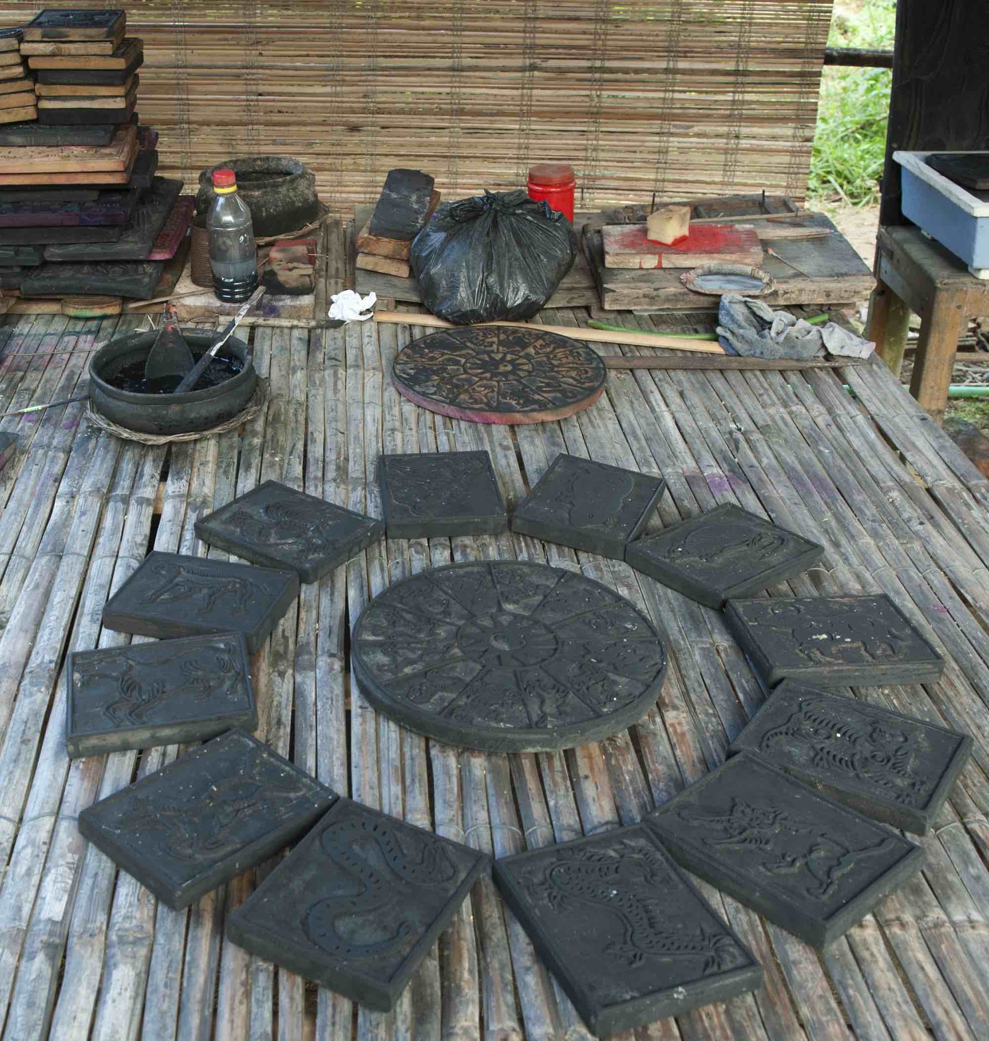 Making these images requires great skill. The drawings are printed on wood-blocks that are carved with sophisticated designs. There are many types and sizes of prints. In the past, the images were printed on do paper, a handmade paper made from the pulp of the Rhamnoneuron tree. Do paper typically measures 25×70 centimeters. It can be cut into smaller pieces. If the drawing is big, the craftsmen lay the wood-block on its back and use a spreading tool (a dried piece of coconut) to spread black color onto the wood-block. The paper is applied and rubbed with a sponge to transfer the color. For smaller images, the papers are placed under the wood-block. The black prints are left to dry before being colored. The wood-blocks are made from jackfruit wood. The process of coloring requires care, speed and skill.