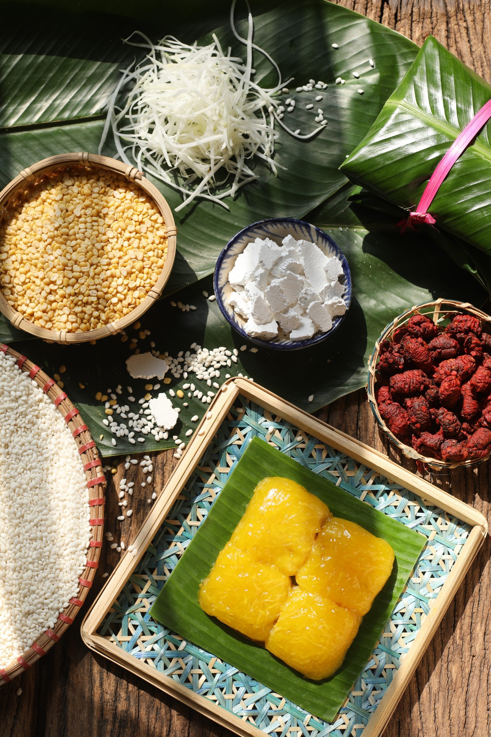 The first speciality that comes to mind when visiting Bac Ninh is Phu The cakes, which translate as “Husband and Wife” cakes. Two shiny yellow cakes are wrapped in dzong leaves (Phrynium placentarium) and tied together with red strings that symbolize the conjugal bond. The cakes are made of sticky rice flour and colored with ground cape jasmine seeds. The filling is made of split mung beans and shredded green papaya. Phu The cakes are a simple yet unforgettable gift from this province.