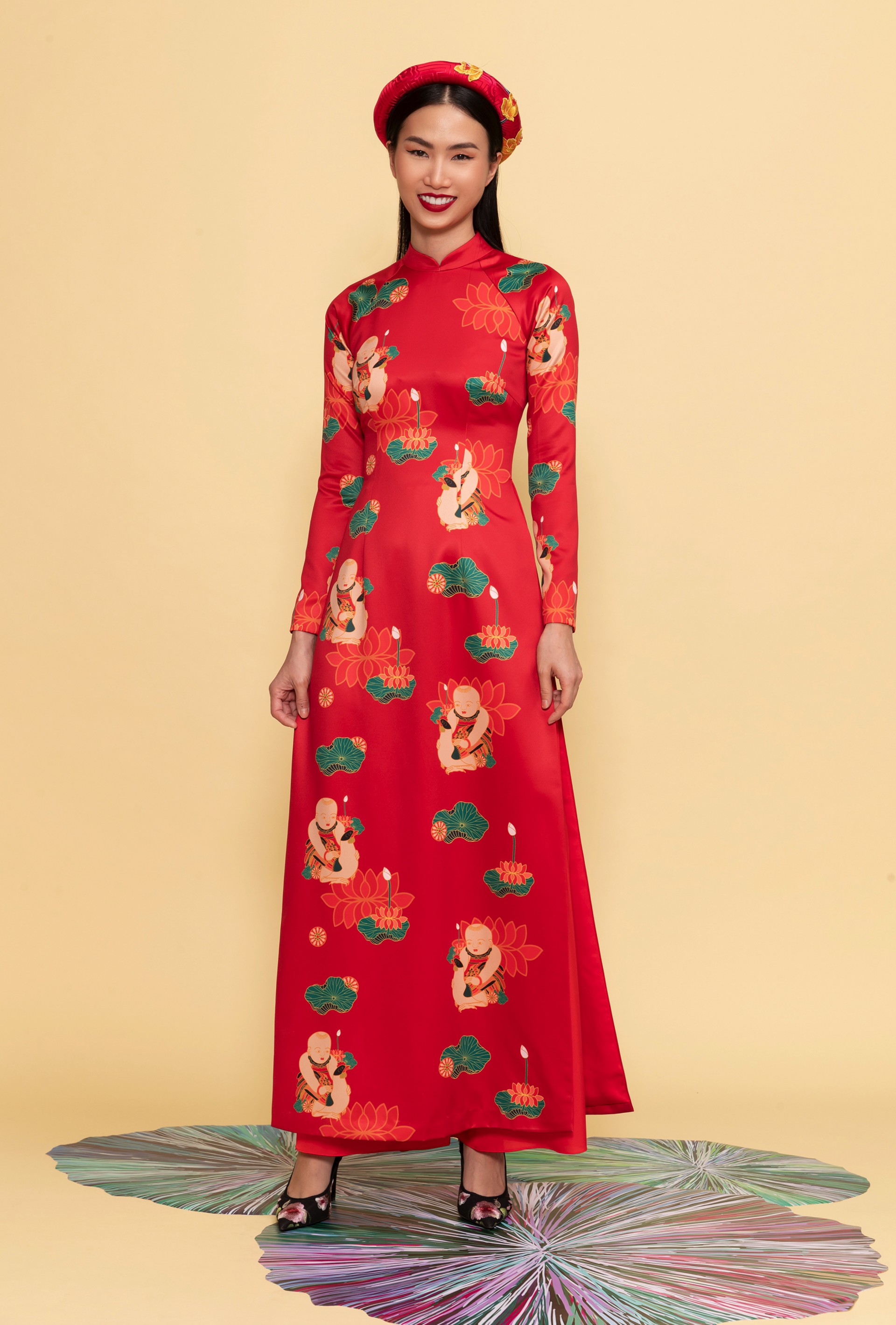 Thuy Nguyen has become a household name in recent years when it comes to revised and updated áo dài. In 2018, Thuy Nguyen launched her signature “Lady Ba of Saigon” áo dài collection, based on breezy and inspiring spring designs leaning toward classical forms and poetic inspirations. This New Year season, Thuy Nguyen introduced her new collection “Lotuses,” wedding a floral theme with Vietnamese folklore to accentuate the traditional, refined and delicate radiance of her áo dài. Taking advantage of her signature brocade, Thuy Nguyen utilized digital printing techniques to present hand drawn graphics in the form of revised and renewed folk mascots in harmonious juxtaposition to classical patterns of leaves, flowers and the zodiac animal of the year.