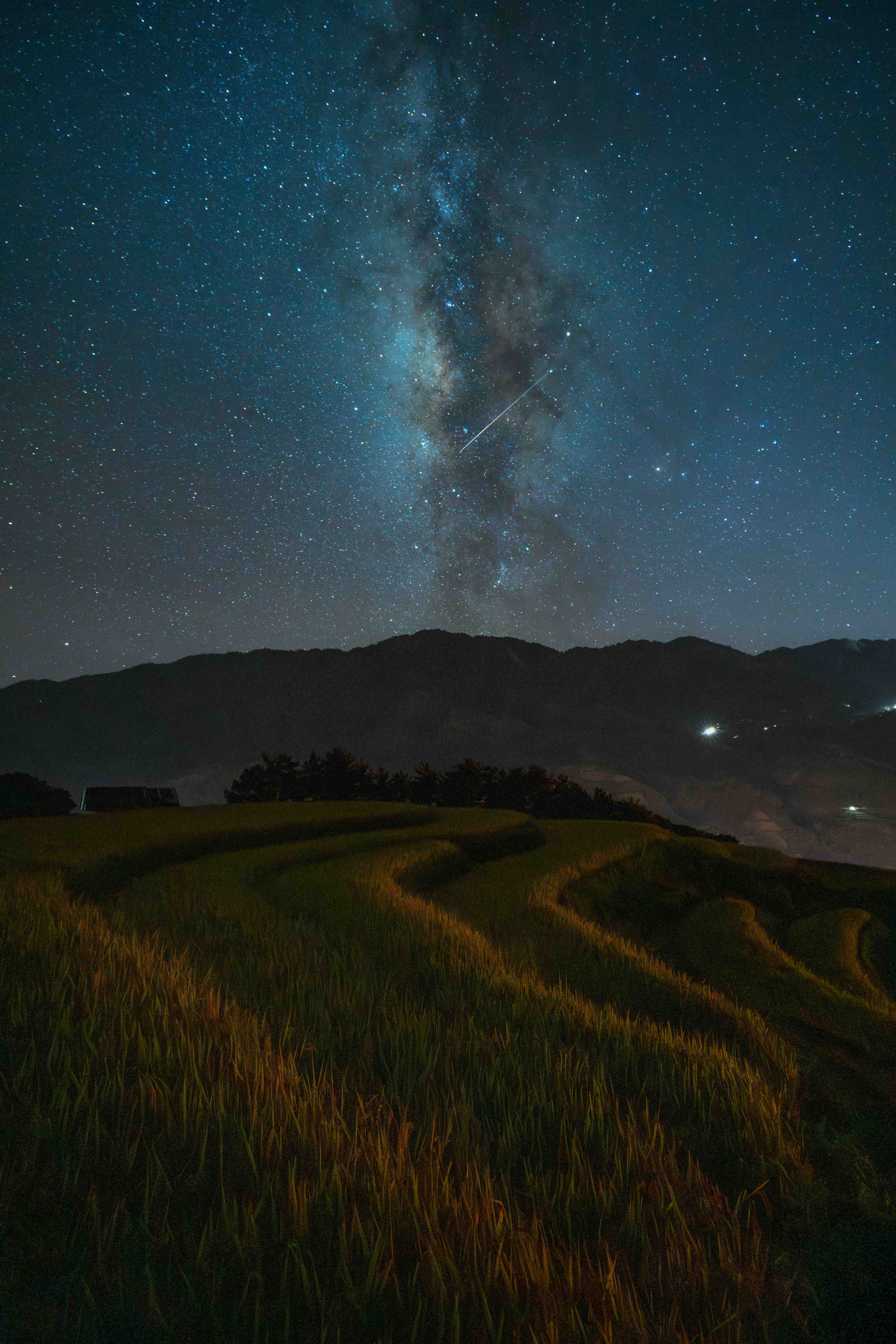 By September, the Milky Way no longer stretches horizontally across the sky as it does in early summer. For night-sky photographers, this is the tail end of the season, when the Milky Way appears to rise almost vertically from the horizon, sometimes sharing the heavens with the moon depending on the time of month. Even so, its shimmering light is enough to outline the graceful sweep of ripe rice stalks bending under their own weight, following the curves of the terraced slopes ready for harvest.