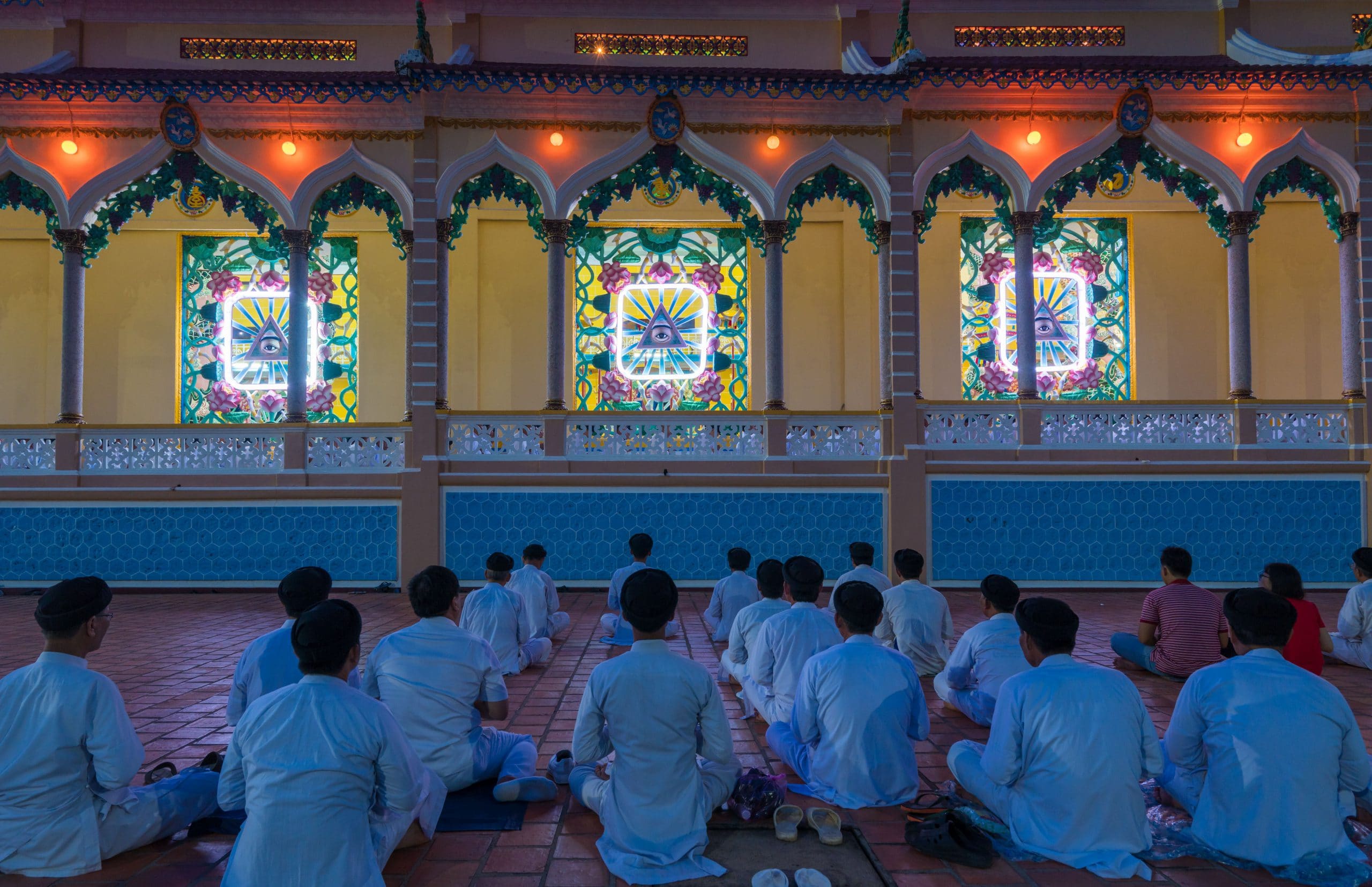 Caodaism’s one-of-a-kind religious architecture reflects the religion’s harmonious combination of Eastern and Western philosophies and spiritual elements. Caodaism’s iconic symbol is the Divine Eye, or the ‘All-Seeing Eye’, which represents God in the form of a giant eye inside a triangle. This symbol is painted in many places around the Holy See. To enter, there are 12 gates, all engraved with the Four Holy Beasts (the Dragon, the Qilin, the Turtle and the Phoenix). The largest is the main gate, further adorned with an image of ‘two dragons fighting for a jewel’. The Temple of the Divine Eye, the main function hall, holds the Universe Globe decorated with 3,027 stars representing 3,000 worlds and 72 globes. Each year, during the Mid-Summer Holiday, an annual celebration named ‘Religious Banquet for the Great Mother and the Nine Goddesses’ takes place. Special features of this festival include splendid sculptures made from fruit, and offering exhibits to the Fairy Lady, inspired by folk beliefs that the Great Mother and the Nine Goddesses will descend to earth and bless everyone with peace and harmony in life. The Banquet is a vital part of Tay Ninh in general and Caodaism’s spiritual activities in particular, not only reflecting sacred beliefs but influencing people’s normal lives.