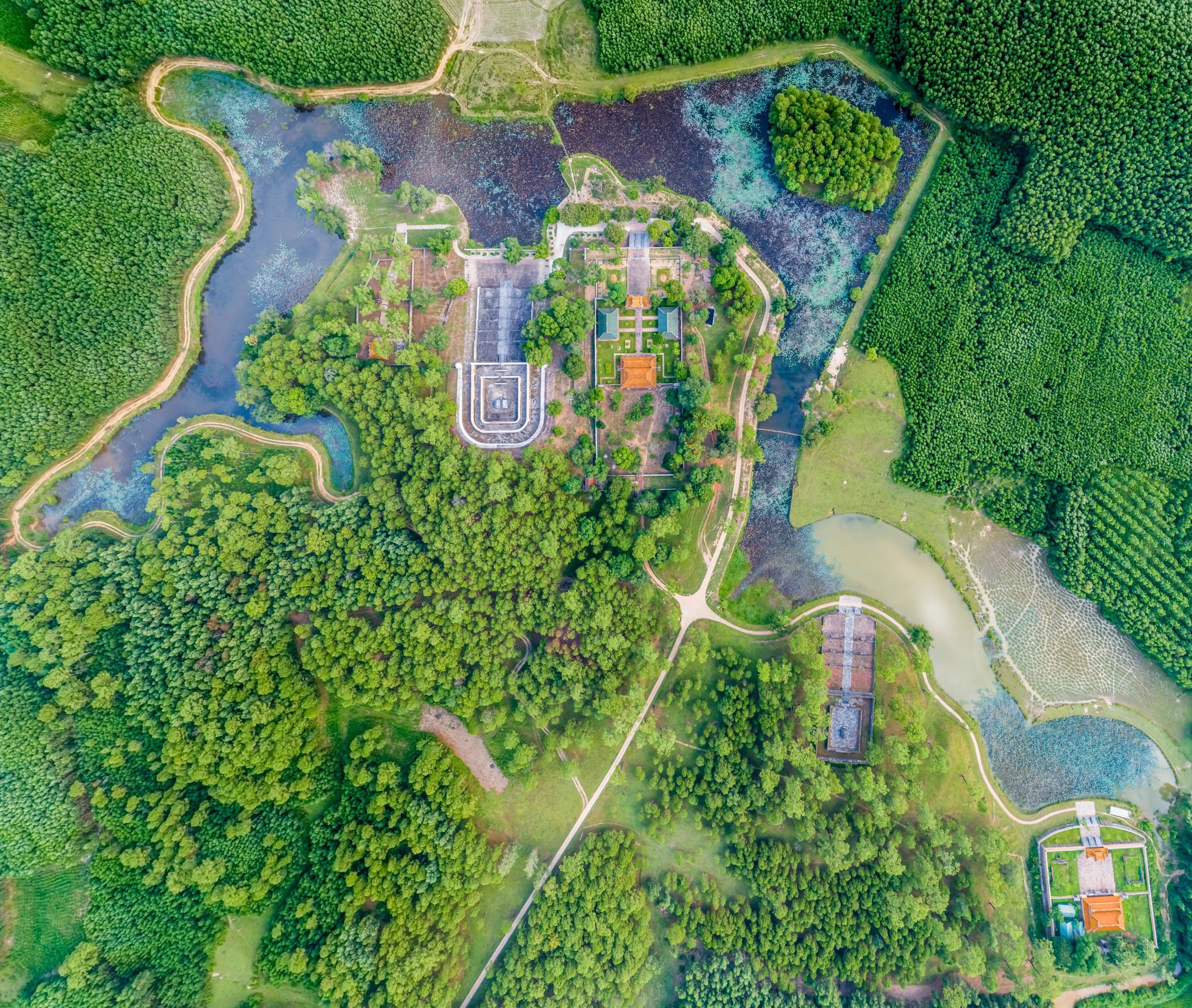 The Nguyen dynasty’s capital had an ideal location, with Kim Phung Mountain as chu son (key mountain), Ngu Binh Mountain as tien an (protective front), the Huong River as song truoc (main river), and Bach Yen as song sau (supporting river). In addition, the Kim Long River runs through the area as the noi thuy (inner water), and the Huong River islets of Hen and Da Vien serve as ta thanh long (blue dragon on the left) and huu bach ho (white tiger on the right).