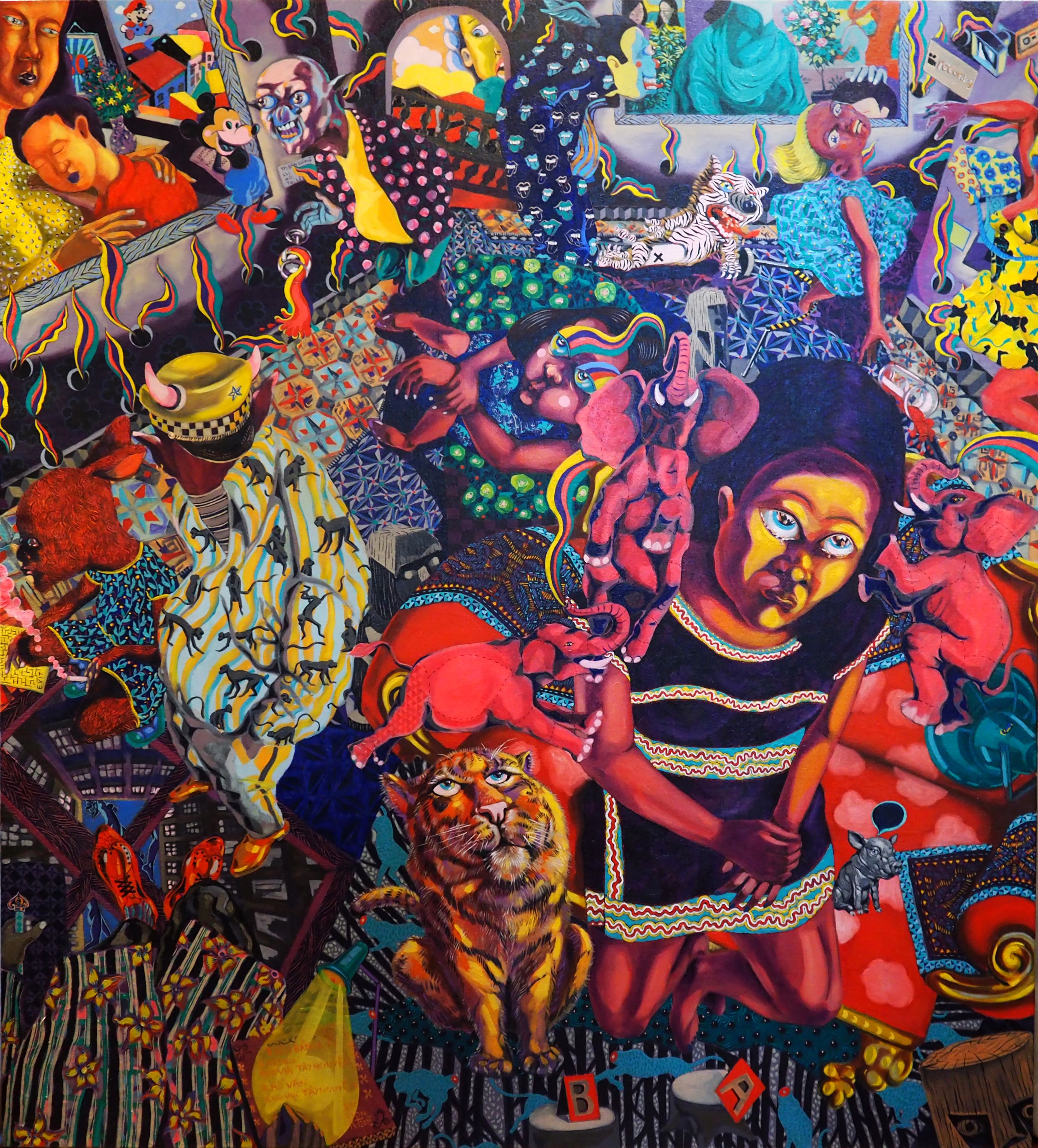 Taking his liberty with lacquer, Bui Quoc Khanh has taken a “pop” approach and a fresh perspective in “H’reng trong bao tang” (H’reng in the museum). The painting depicts a young woman from the Central Highlands with a sad look in her eyes, gazing up at the sky and at a society that is materially rich but in which historical and cultural values are only displayed in museums. The painting somehow satirizes our contemporary society where our rich culture is gradually disappearing and may disappear for good if we do not take real action. Also making use of the material, Nguyen Minh Hieu’s “Dang sau cua coi tam I, II” (Behind the gate of a temporary realm I, II) series uses distinctive decorative patterns of the Central Highlands to tell myths about the gods often mentioned in epics and songs. In an impressive artistic style, Pham Ha Duy Khanh’s “Giac mo ban so 2” (Dream of the village No.2) expresses his strong feelings about life in the wild highlands.