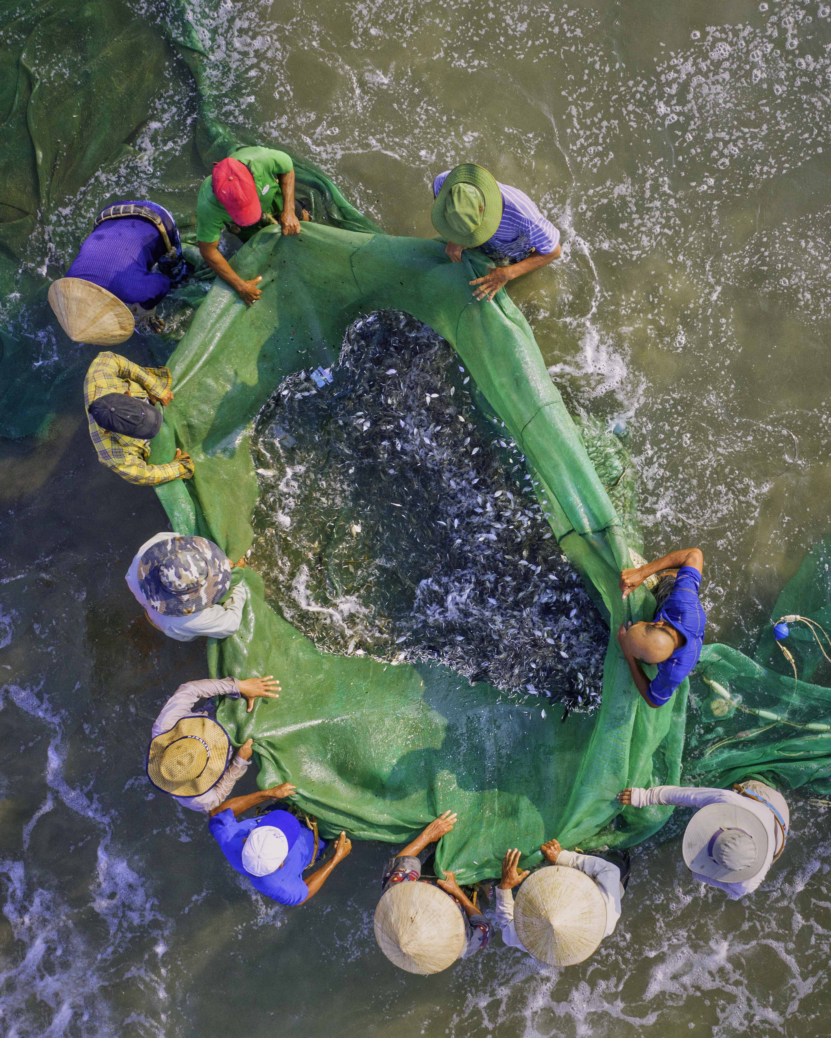 Seine fishing is a method of near-shore fishing that uses a surrounding net, called a seine, which hangs vertically in the water. The fishermen of Man Thai use this type of net year-round, with early morning and dusk being the best time to catch fish. The seines are wall-shaped nets that stretch from 500 to 1,000 meters in length, with the weighted bottom edge trailing down to the seafloor. The net floats thanks to buoyant tubes on the top side.