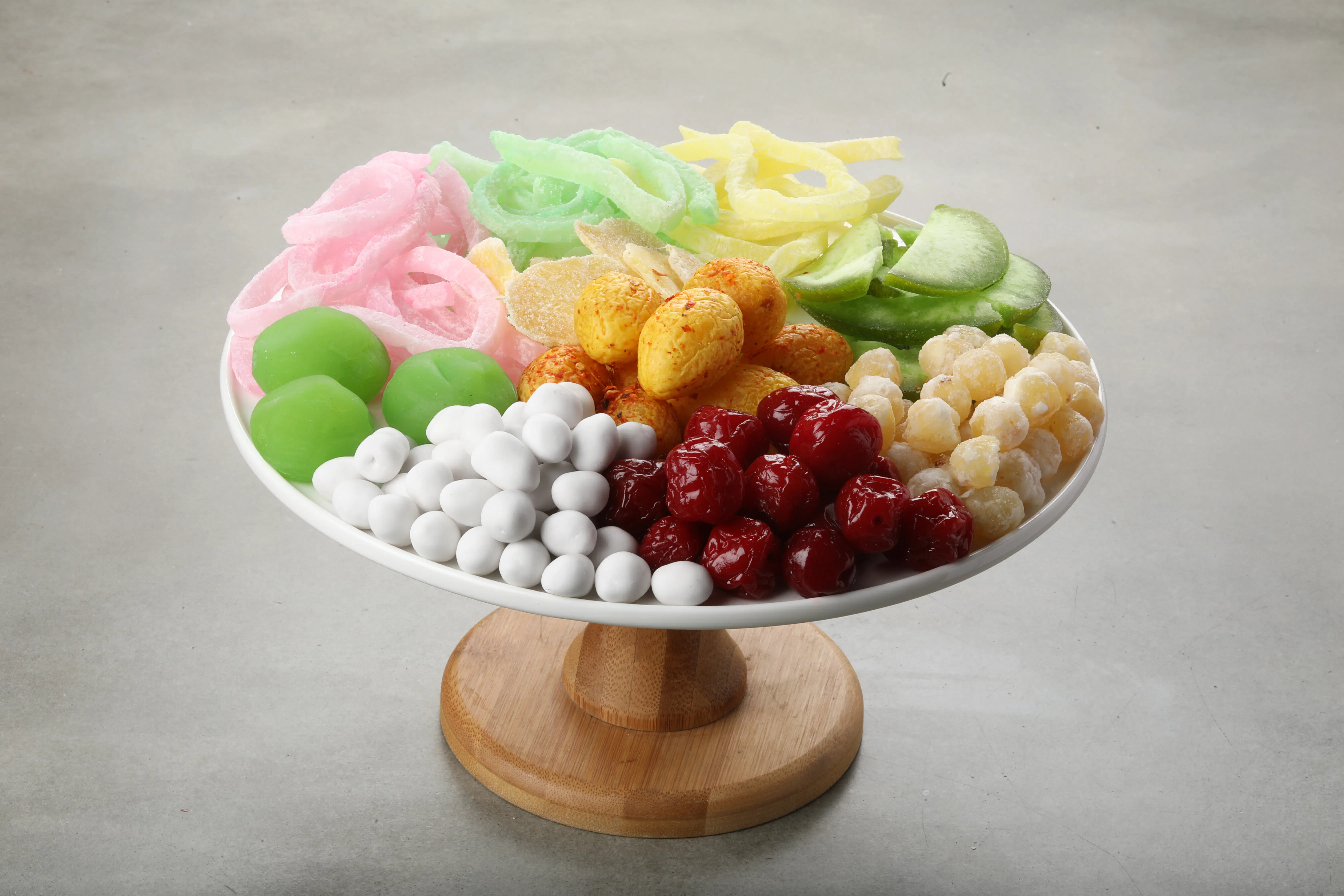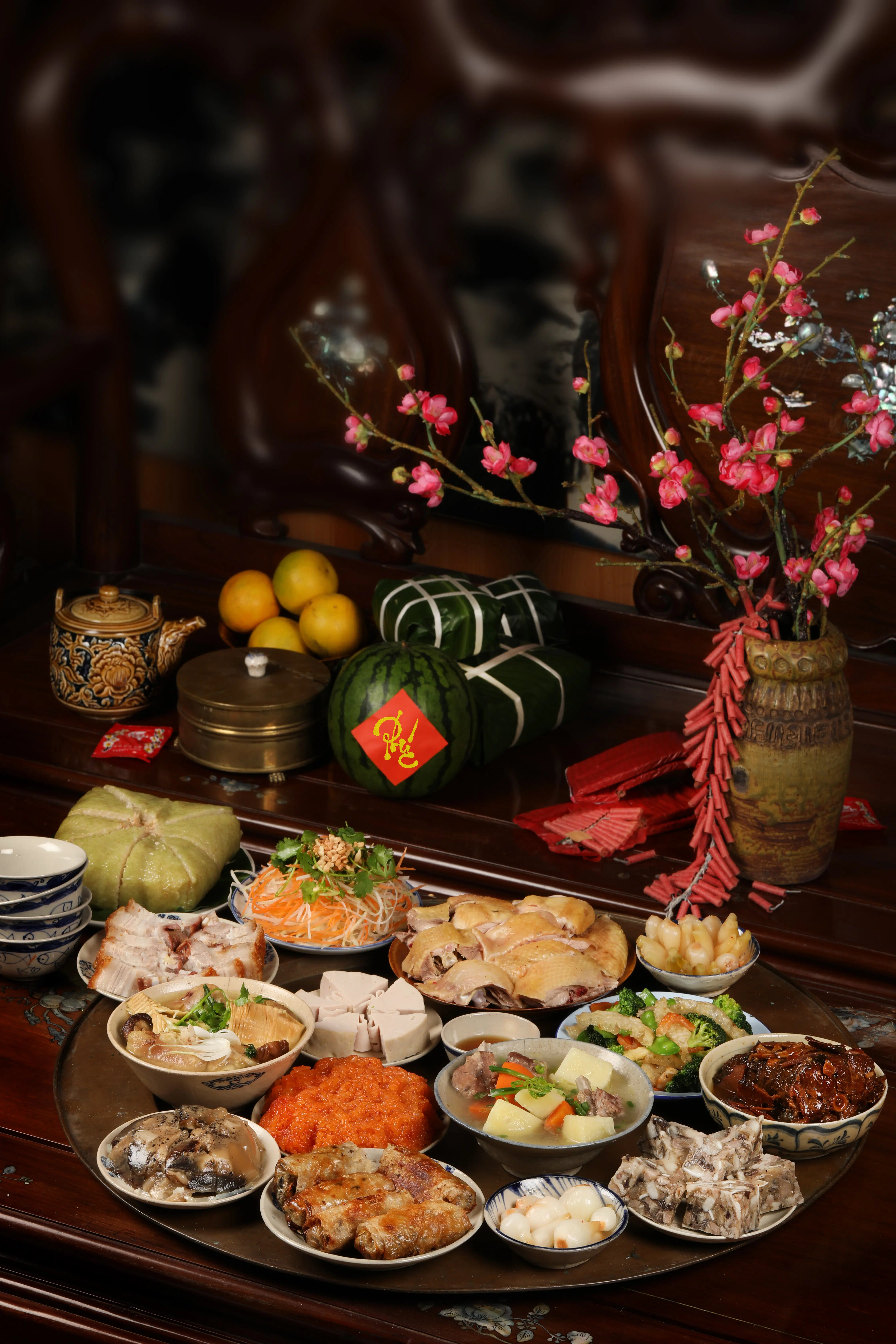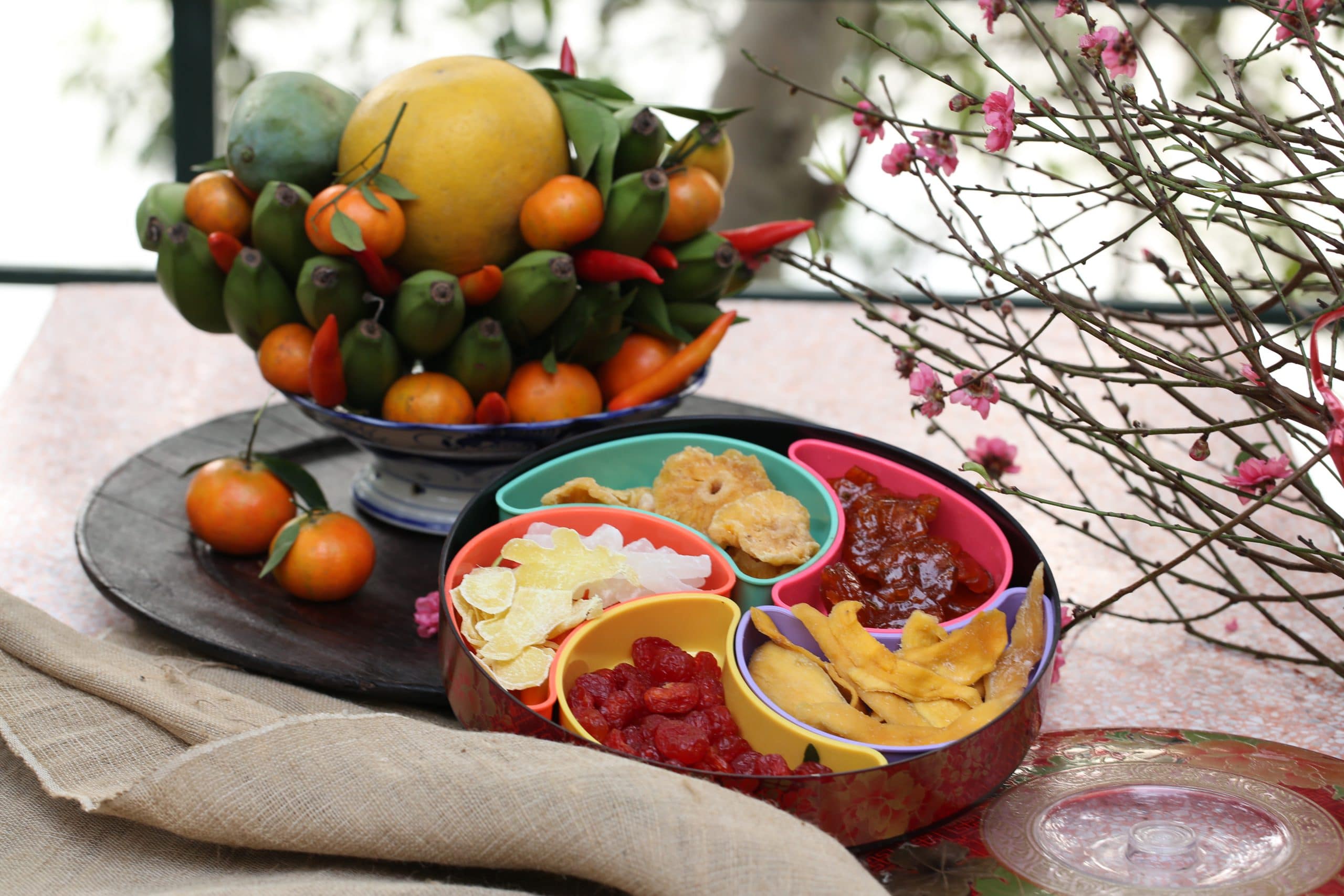 At the center of the Tet altar lies a flavorful and colorful five-fruit tray. Here in the North, the tray symbolizes the Five Phases – green bananas for Wood, yellow pomelos or fingered citrons for Earth, red chilies or reddish-orange tangerines and kumquats for Fire, and so on. Meanwhile, in the South, the tray might be made up of sugar-apples, figs, coconuts, papayas, and mangoes, whose names put together forms “cầu sung vừa đủ xài,” which sounds similar to “wishing for sufficient wealth.” The altar must incorporate a set of three or five well-cleaned ceremonial objects, along with candles.