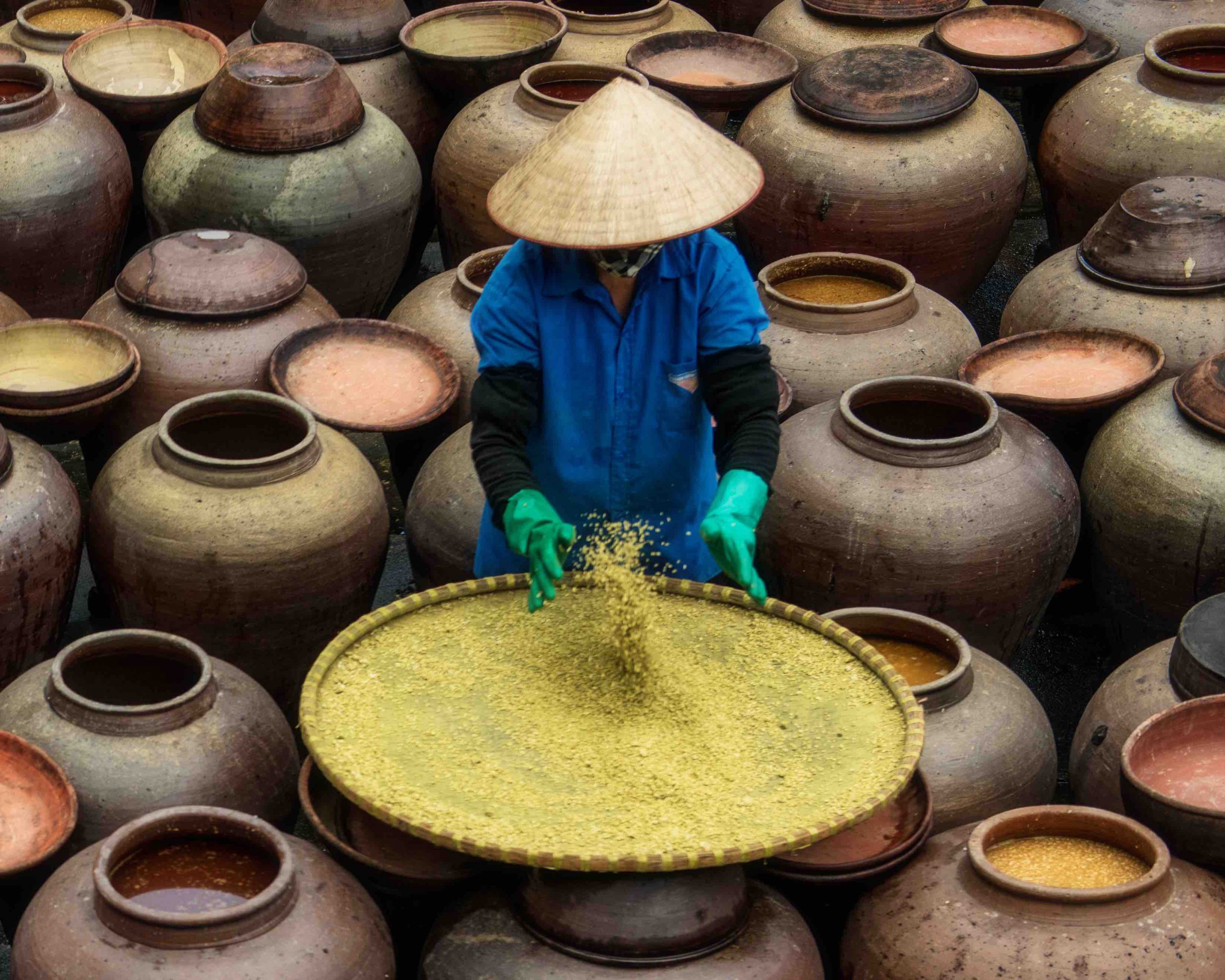 Amidst hundreds of brown earthen jars drying in the honey-gold sun, the sauce-makers hurriedly pour sauce from buckets into jars before stirring it and checking its color. As harvest day nears, the sauce darkens in color, mirroring the growing joy of children anticipating new clothes and shoes, and parents planning to repair roofs, pave yards, or build fences. Beneath white conical hats and behind veils that reveal only their eyes, smiles can still be seen on the faces of the women diligently making this sauce.