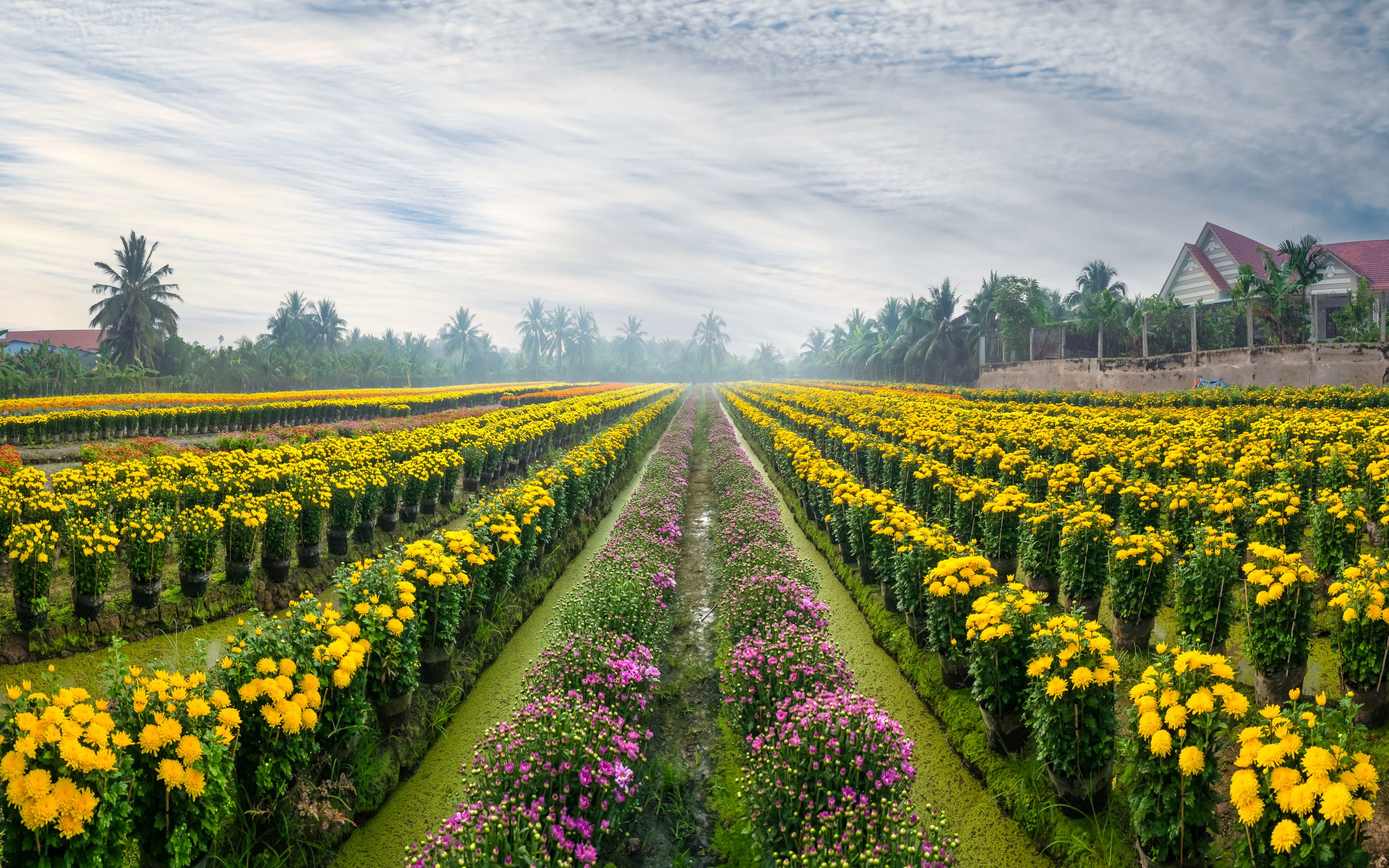 The most popular flowers in Tien Giang include chrysanthemums morifoliums, marigolds, Cockscombs, Dutch daisies, Liasianthus, and gerberas. The flower fields are especially picturesque at dawn when soft, ethereal mist lingers over the flower beds.