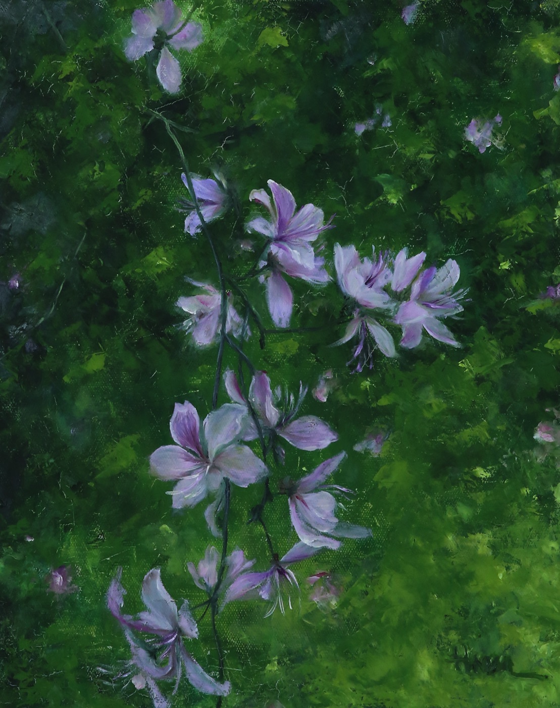 Yet that is only as far as the eye can see. By viewing the paintings through the lenses of emotion and memory, visitors will be able to perceive a vein of energy flowing underneath the surface. Flowers have always been symbols of beauty. However, only through silence can we perceive that beauty as it condenses in space and tap into the vitality long hidden inside delicate petals. By closely observing, we can see a unique and introspective beauty that transcends the fragility of the subject matter: quiet and calm, unbound and passionate, and made from the very fabric of our daily lives.
