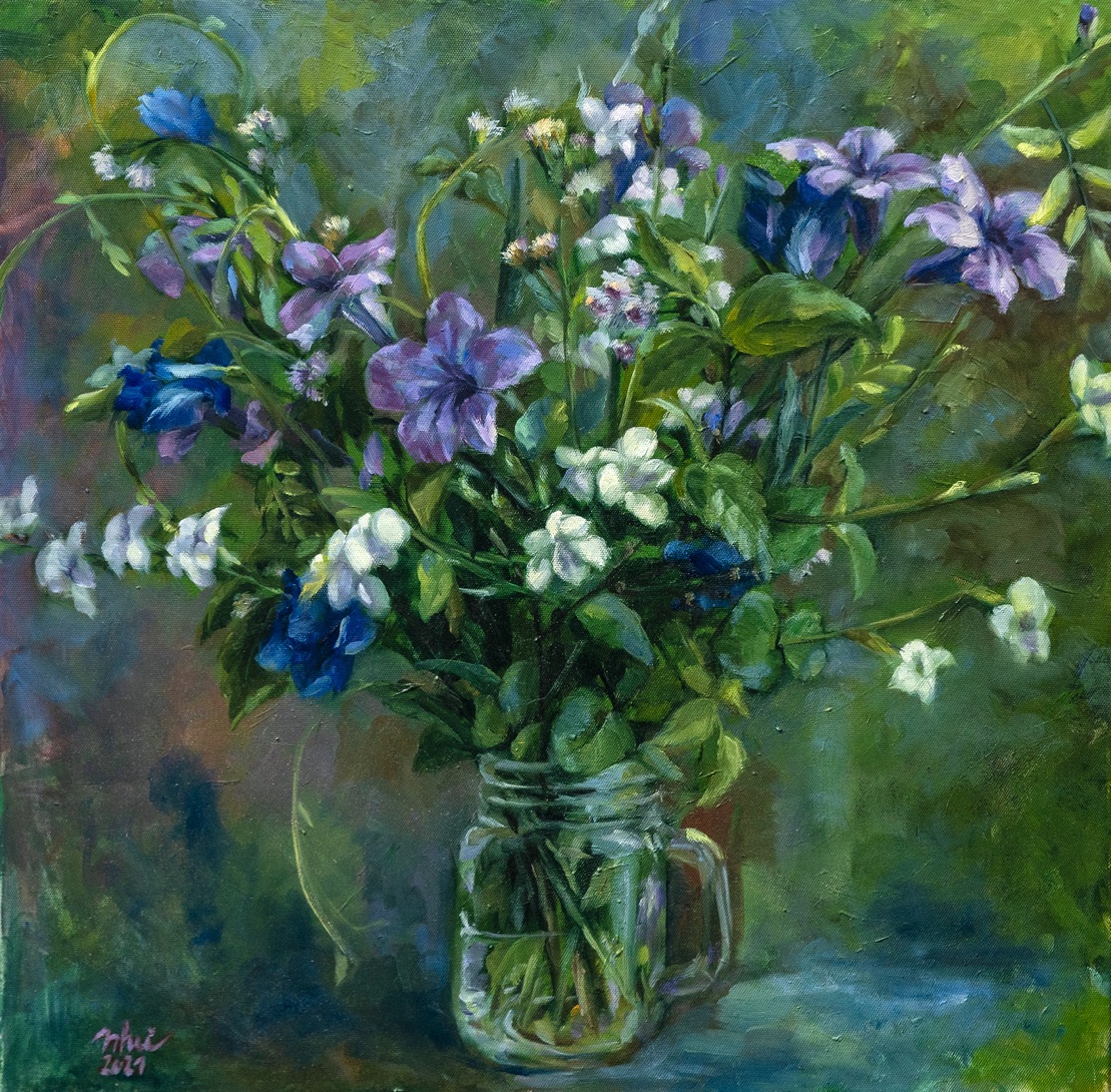 Vibrant contrasts, meanwhile, can be perceived in Dao Nhu’s paintings as she chooses flowers that dance in full, glorious bloom. Yet we can also spot some wilted flowers in the ensemble and even some fallen petals. This seems to evoke the fleeting nature of past experiences.